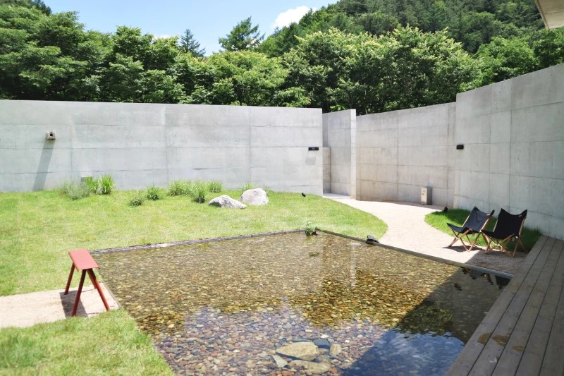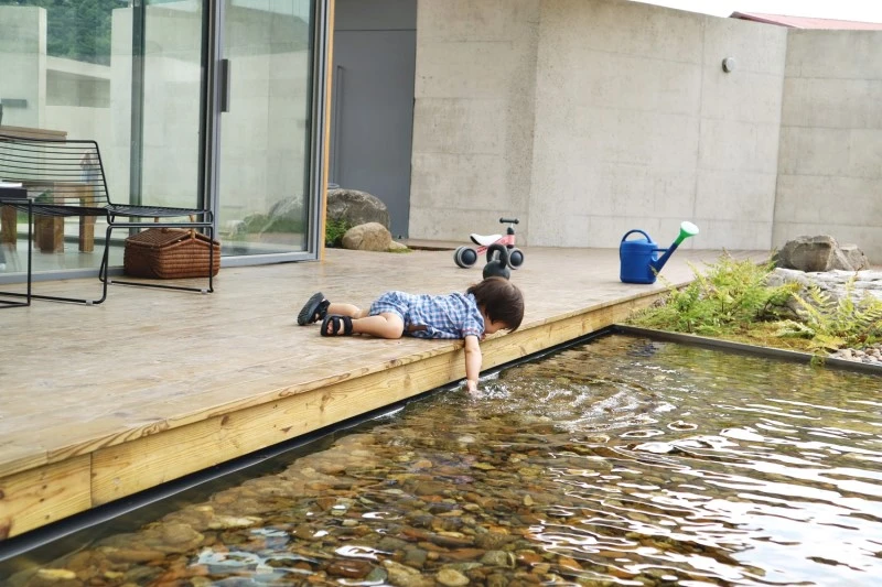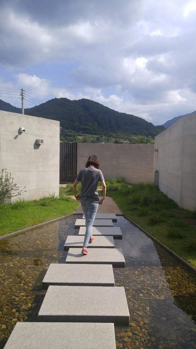 서림연가는 마당에 작은 시내를 두 개 만들어 두어 아이들이 첨벙 첨벙하며 물고기를 찾는 것이 아주 귀여웠는데, 사실 서림연가 뒷 편에는 그 유명한 무주 구천동 계곡 중 작은 줄기가 흐르고 있다. 그 쪽으로 가는 길이 조금 위험해보이긴 하지만, 동네 주민분들 말씀으론 그 곳 평상에 누워 그들만의 휴식시간을 즐기시는 듯했다. 우리도 보면서 가족끼리 와서 발장구 칠 수 있는 물놀이 정도는 좋겠다 라며 다음에 꼭 다시 와야겠다는 말 반복.