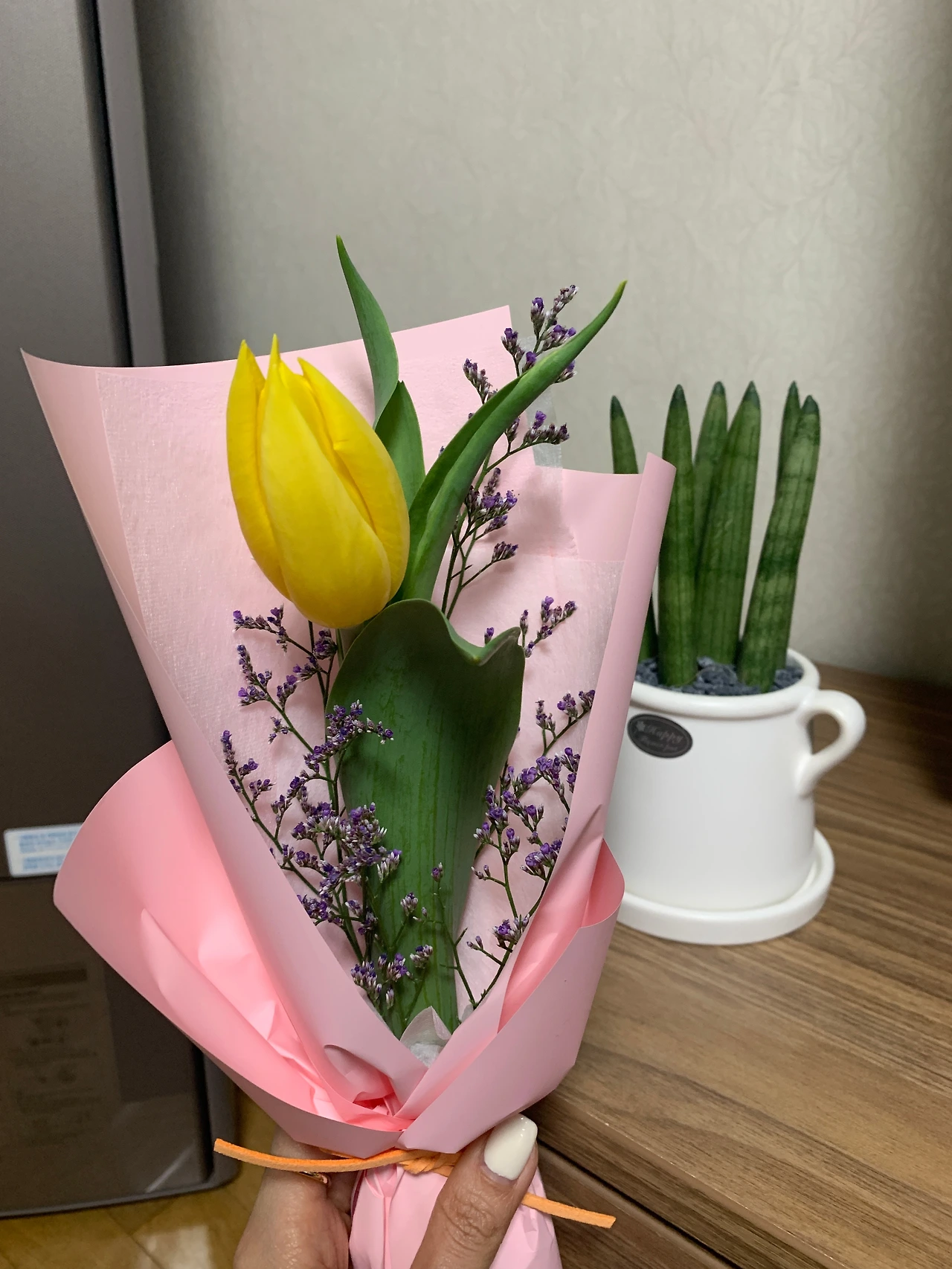 그리고 그의 손에 들린 노란 튤립 한 송이와 미니 스투키. 설마 전날 내가 했던 말을 기억할까 싶었는데 처음 맞는 부부의 날이 새삼 신기했다. 다시 물어보니 점심때 시아버님이 아주버님과 신랑에게 오늘 부부의 날이니 각자 짝지를 잘 챙겨주라는 미션 아닌 미션을 내리셨단다. 그리고 신랑의 머리를 스쳐간 나의 이야기. 그리고 매번 꽃집을 지나가며 작은 스투키를 바라보던 내 눈빛을 기억하고 꽃과 함께 작은 스투키 화분까지 준비했다는 그의 편지는 우리 부부의 첫 번째 부부의 날에 마음을 울리는 뜻깊은 선물이 되었다.