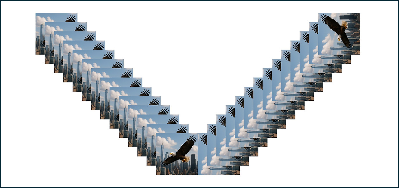 - AI가 생성한 여러 개의 "도심을 비행하는 독수리" 이미지 수 개를 조합하고 재배치해서 새로운 구도를 만든 경우
