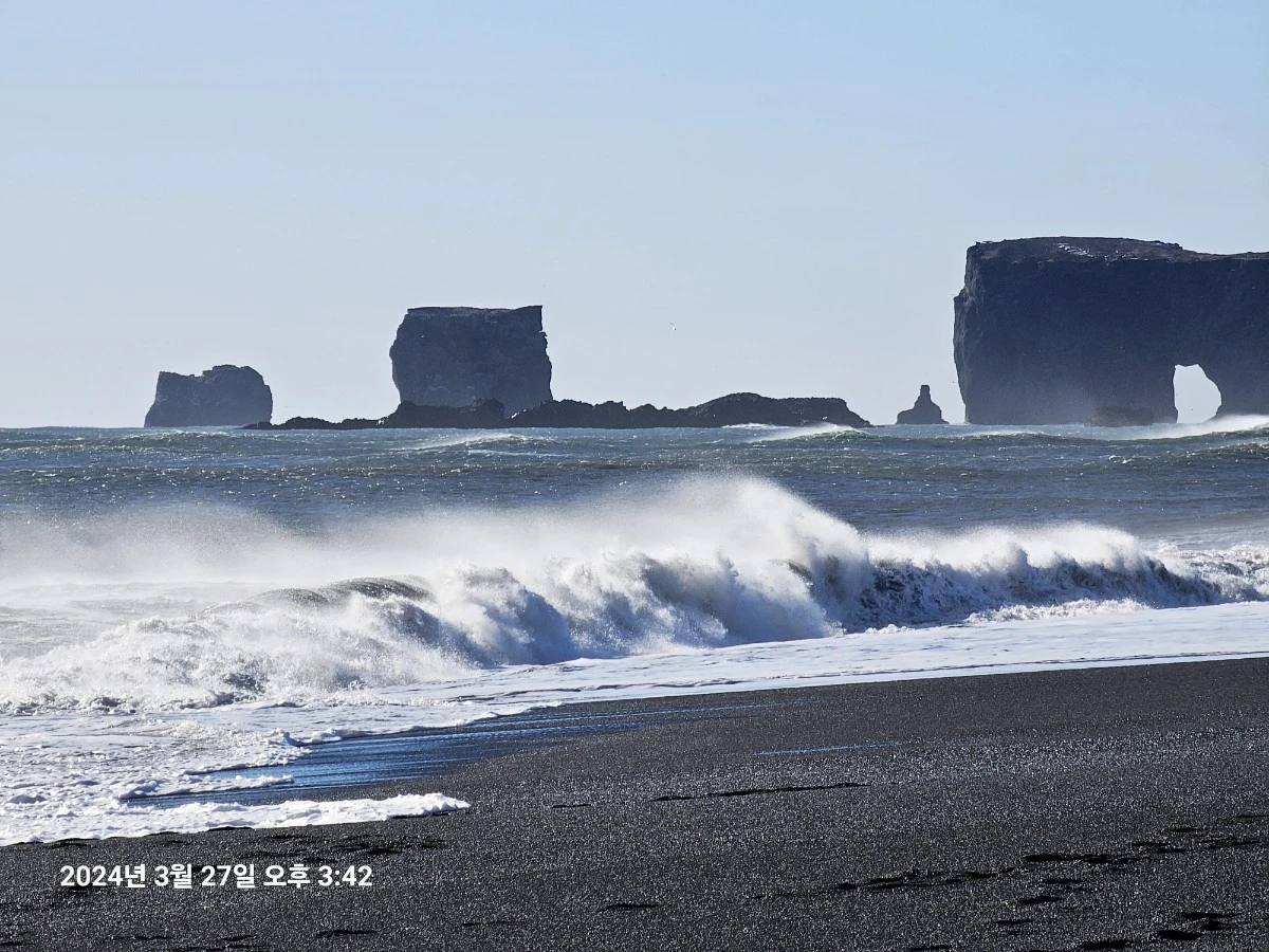 점심으로는 가볍게 소시지를 데쳐 핫도그를 먹고 나서, 우리는 또 하나의 관광지인 검은 모래의 해변에 도착했다. 역시 화산 활동의 여파로 만들어진 긴 검은 빛깔의 모래사장과, 주상절리, 그리고 촛대처럼 생긴 바위들이 늘어서 있는 곳이었는데 고국에 있는 제주가 생각나는 풍경이기도 했다. 여기는 조금 더 규모가 큰 느낌이긴 했지만, 차가운 바닷바람이 워낙 거세게 몰아쳐 따뜻한 곳이 그립다는 생각을 조금 했다. 연약한 인류는 이 행성의 온도 변화에 힘들어한다. 그럼에도 꿋꿋하게 서서 옷을 입고, 거대한 쇳덩이들을 타고 다니며 많은 것을 보고 느끼려고 한다.