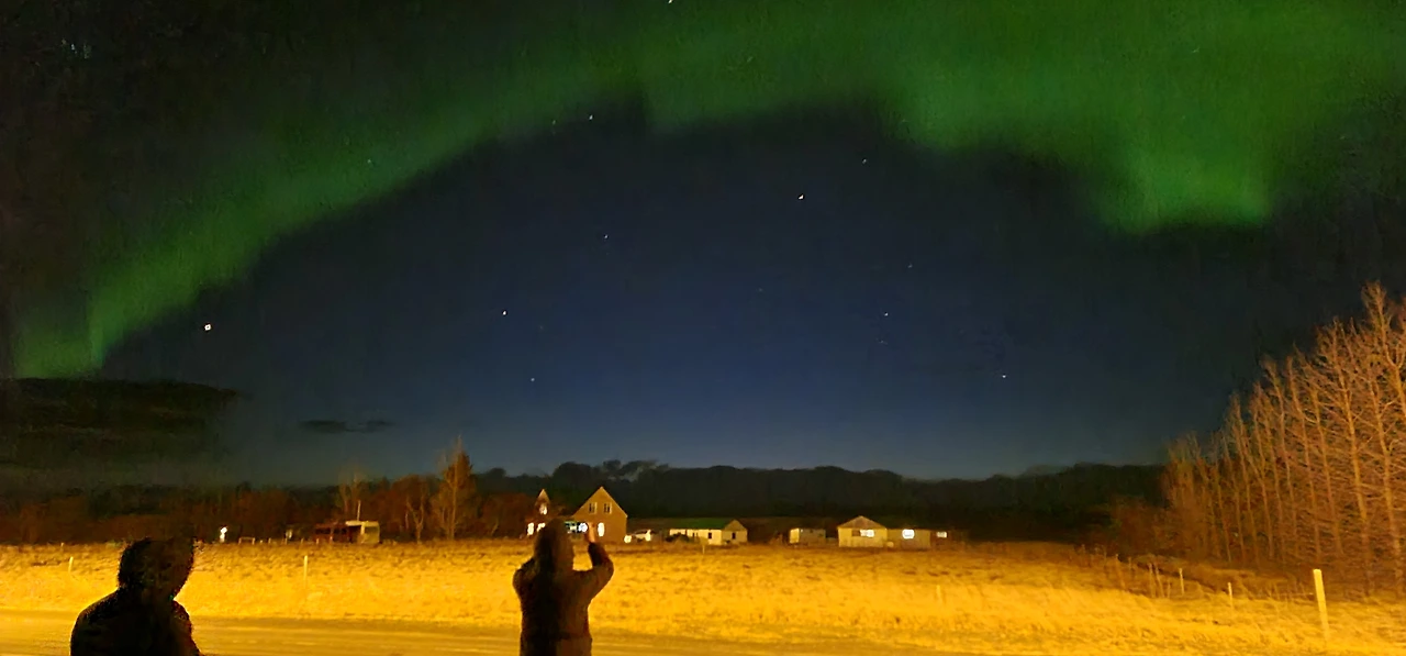 오로라는... 뭔가 말로 표현하기 참 어렵다. 실제로는 카메라에 담긴 것처럼 녹색으로 번쩍거리진 않았는데, 그래도 구름과는 오묘하게 다른 커튼 같은 것이 밤하늘을 가로지른달까. 카메라의 야간 모드로 빛을 축적하면 비로소 우리가 사진에서 보던 녹색 빛깔의 커튼 같은 오로라가 선명해지는데, 그날은 오로라 끝이 일렁이며 춤추듯 흔들리기도 했다. 그날도 너무 추워서 오로라를 조금 보고는 다시 차 안으로 뛰어들어가기를 반복했지만, 4월이 다 되어가는 아이슬란드에서 오로라는 매우 특별한 추억으로 남을 것 같다.