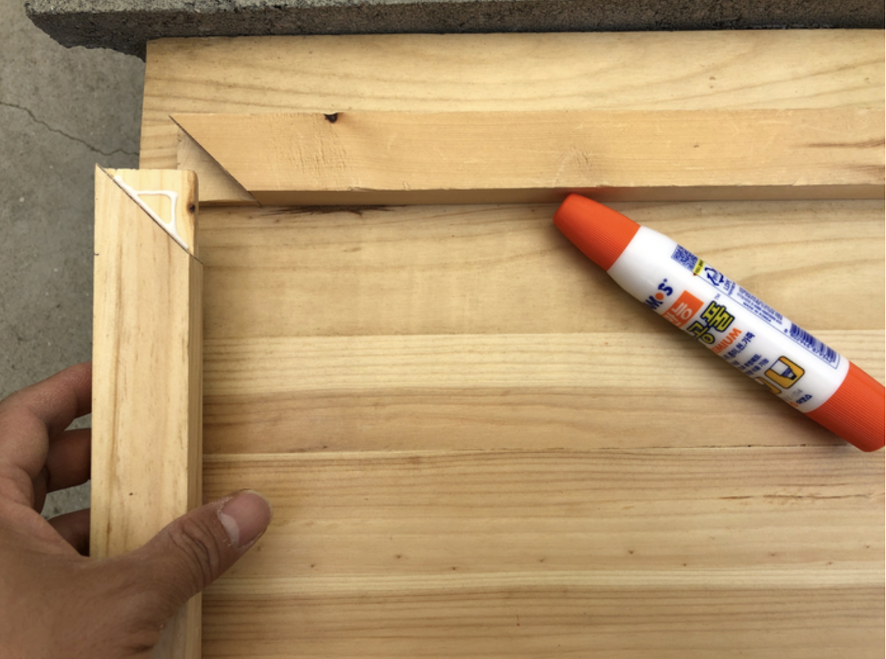 짜맞춤은 연귀맞춤 방식입니다. 먼저 자투리목을 최대한 살려 4개의 틀을 준비하였습니다. 여기저기 잘려나가고 상처 난 자투리목이라 보이는 쪽에 가능한 깔끔한 면을 골라 작업을 했습니다. 목공풀을 발라 자리를 잡고 조임쇠가 없어 비닐끈으로 감아준 뒤 작은 나무 스틱으로 돌려가며 조여주었습니다.