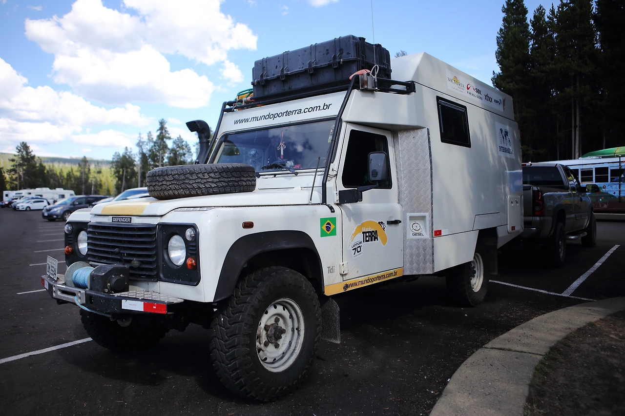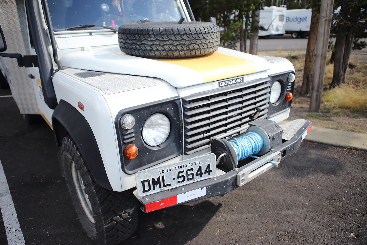 이 랜드로버 디펜더는 자그마치 브라질에서 왔다! "sc sao bento do sul"라는 브라질에서 남쪽 도시에서 대략 계산해봐도 1만 킬로미터를 거리를 운전해 산 넘고 물 건너 여기 미국의 옐로우스톤까지 온 것이다. 6~7번 정도 국경을 넘었을 테고 중간에 육로가 없는 곳도 있어 차를 배에 싣고 넘기도 했을 테다.
