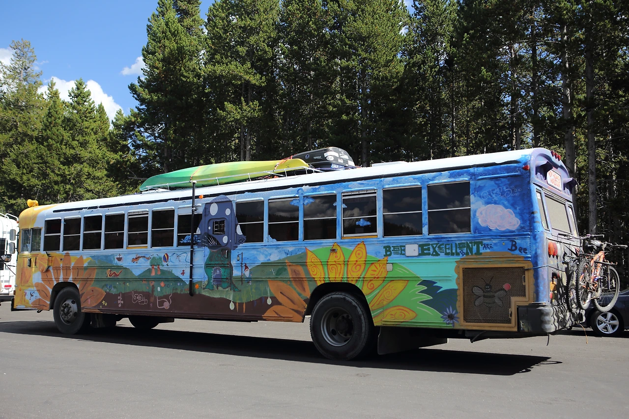 국립공원 입구에서부터 처음 만난 이 버스는 사진을 찍고 싶어 주차장까지 쫄래쫄래 뒤를 따라갔다. 스쿨버스를 개조한 이 버스는 그냥 봐도 여행가의 향기가 느껴진다. 벽화처럼 핸드 패인팅으로 버스 외관에 그림을 그렸고, 버스 지붕에 루프 박스와 카약이, 후방에는 자전거 달려 있었다. 자전거의 사이즈와 개수로 짐작하건대 젊은 커플이 다양한 액티비티를 즐기며 장기 여행 중인가 보다. 버스 여기저기에도 낙서와 함께 '월드 트래블러'라는 말이 쓰여있었다. 드라이버를 꼭 만나 보고 싶었지만 아쉽게도 얼굴을 보지는 못했다.