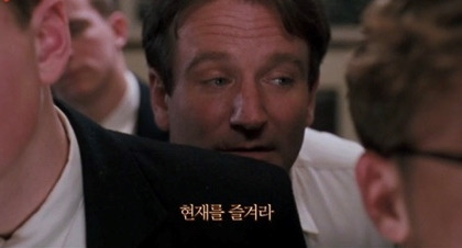 "현재를 즐겨라. 시간이 있을 때 장미 봉오리를 거두라. 왜냐하면 우리는 반드시 죽기 때문이지. 믿거나 말거나 여기 있는 우리 각자 모두는 언젠가는 숨이 멎고 차가워져서 죽게 되지. 자, 귀를 기울여 봐, 들리나? 카르페디엠. 현재를 즐겨라! 인생을 독특하게 살아라!"