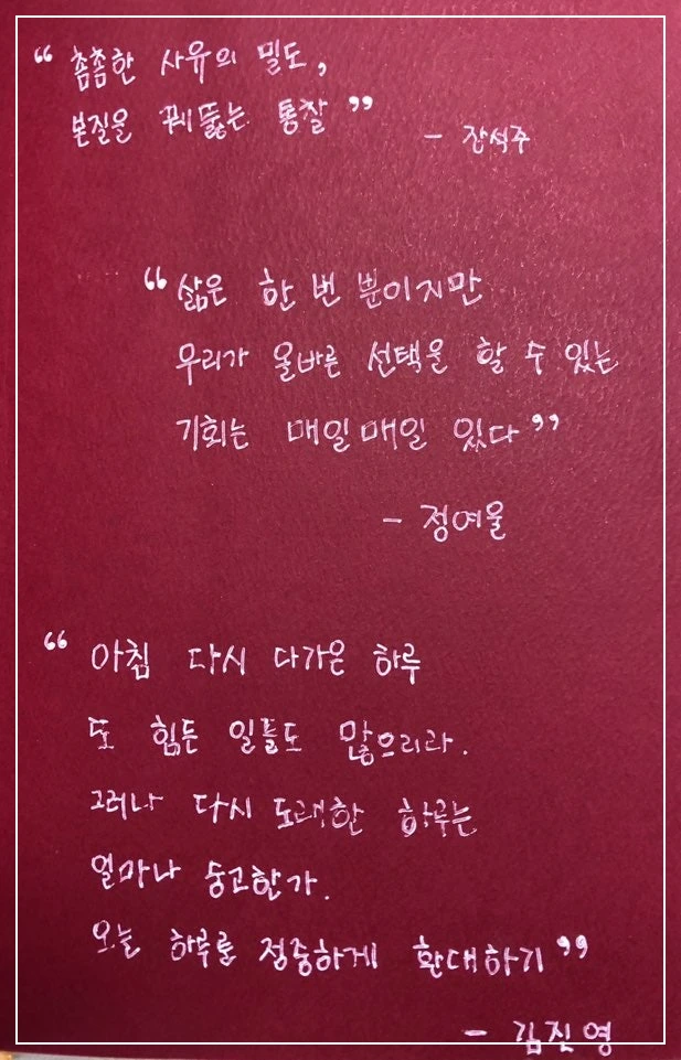 "연말이 되면 다이어리를 마련해 첫 문장을 고민합니다. 새해 새날들을 이끌어 갈 올해의 문장으로 마음을 다림질하는 것이지요. 아직 겨울이 한창이지만 다이어리에 반듯하게 새겨 놓은 희망은 다가오는 봄에 대한 기대를 불러옵니다."