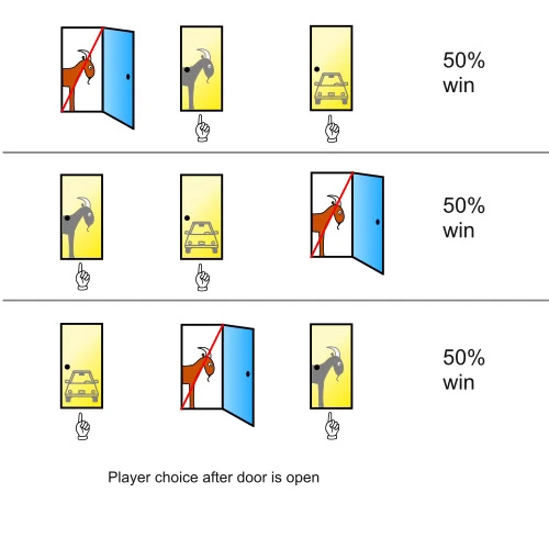 이때 진행자는 자동차와 염소가 어떤 문에 있는지 알고 있기 때문에, 진행자가 자동차가 있는 문을 여는 일은 절대 발생하지 않는다.