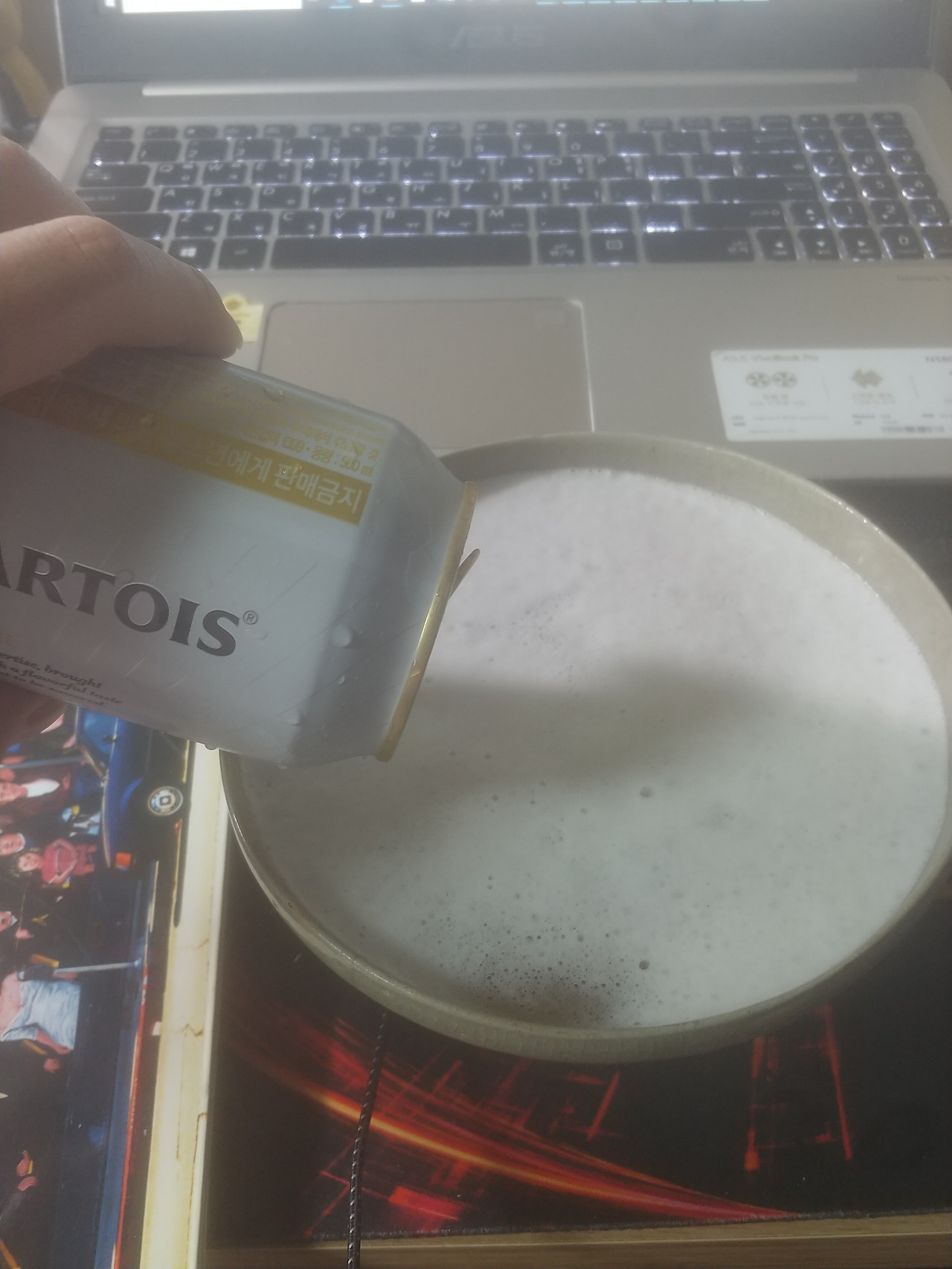 하지만 청자대접의 감동을 다 느끼고 나니, 그만 몹쓸 상상력이 발동해 버렸다. 고려청자에 홍차를 마셔 봤으니 다른 음료와의 궁합도 알아보고 싶었다. 마침 냉장고에 스텔라 아르투아 한 캔이 있었다. 나는 망설임 없이 맥주를 따랐다. 그런데...