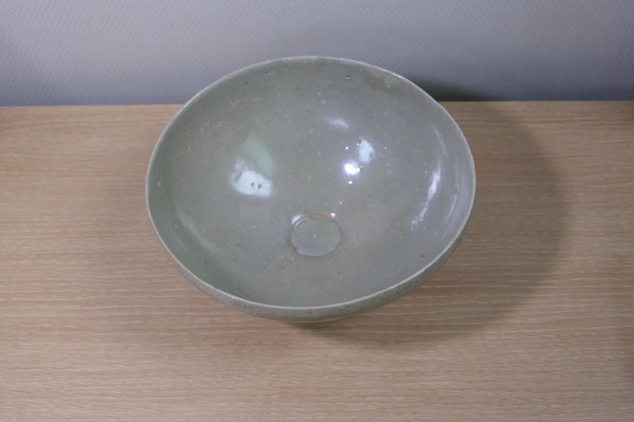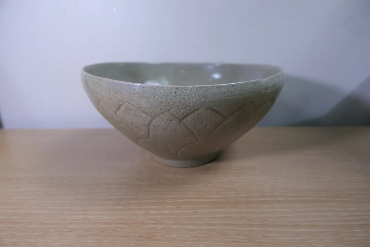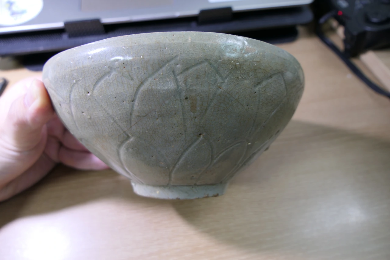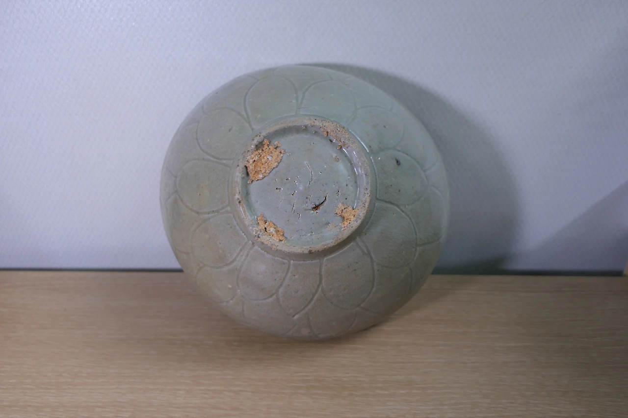 비색을 띈다고 하기엔 살짝 모자라지만 전체적으로 고르게 잘 발린 푸른 유약. 그릇 안팎으로 예쁘게 난 자글자글한 빙렬. 손으로 하나하나 그린 연꽃잎 무늬. 굽 아래에는 구울 때 그릇이 바닥에 달라붙지 않도록 네 군데에 굵은 모래를 받쳐서 구운 흔적이 남아 있었다. 손톱으로 살살 두드려 보면 나는 '팅' 소리가 반대편 벽에 청아하게 울린다. 옥에 티를 하나 꼽자면, 이 도자기는 위에서 봤을 때 타원형으로 살짝 일그러져 있다. 벽을 최대한 얇게 만들다 보니 완벽한 원형을 빚어내진 못했으리라. 너비는 가장 긴 부분이 16.9cm, 짧은 쪽이 15.8cm이다. 7cm를 넘지만 8cm엔 약간 모자란 높이. 전형적인 대접 사이즈다. 칼로 연꽃무늬를 새겨 유약을 발라 구운 청자 대접이니 문화재 작명법에 따라 그럴듯한 이름을 짓자면 '청자음각연판문발' 정도가 적당할 것이다.