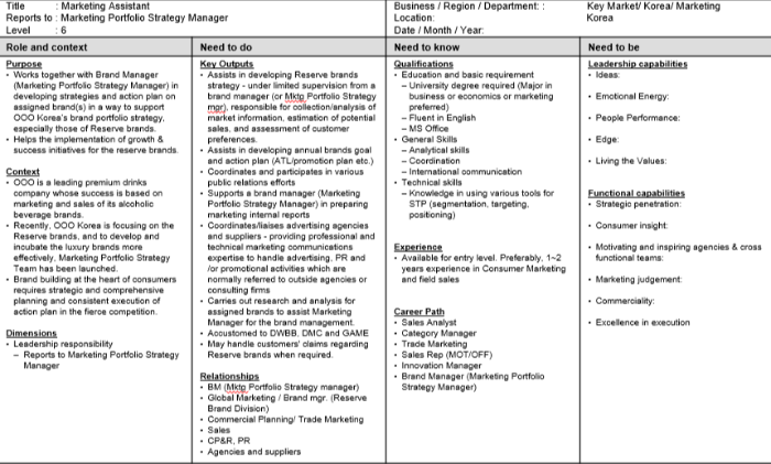 까지 미리 정리해놓고 있다. 보통 직무기술서, Role Profile 등의 이름으로 불리는 문서에 담겨있다. 회사마다 정리된 수준이 다르기는 한데, 좋은 회사일수록 최상의 성과를 내기 위해서는 어떻게 포지션을 세팅해야 하는가를 깊게 연구하기 때문에 이런 Role profile이 정교하다.