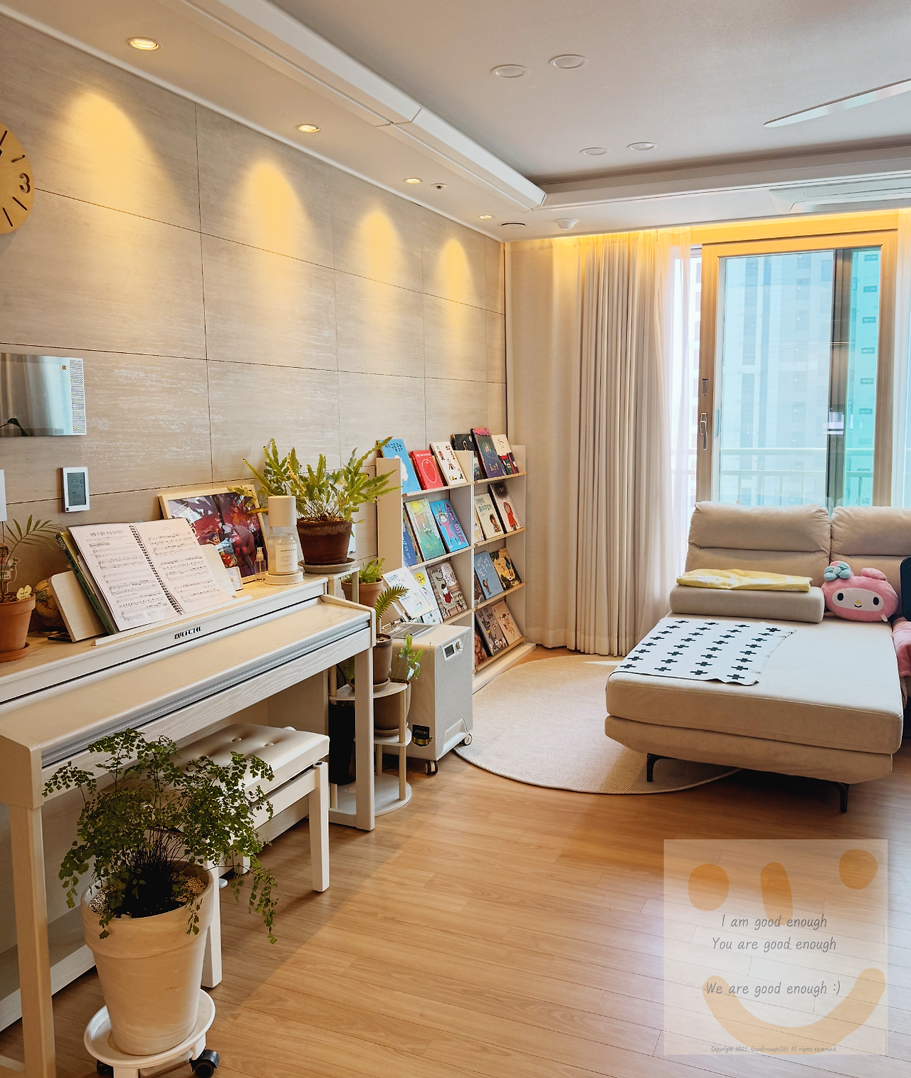 내가 애정하는 피아노와 그림책이 함께 보이는 거실!