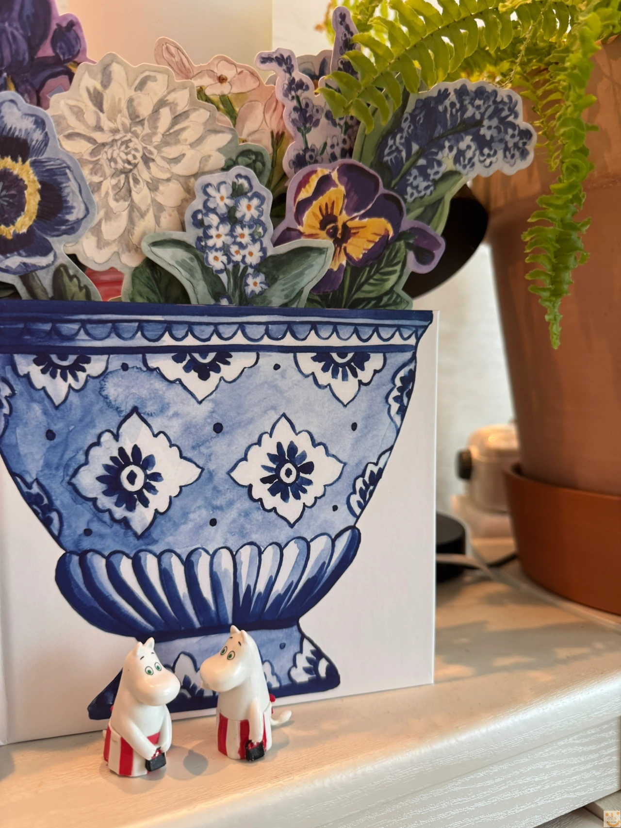 피아노 위의 플라워 팝업북과 그 앞에 있는 무민마마 피규어 바라보기