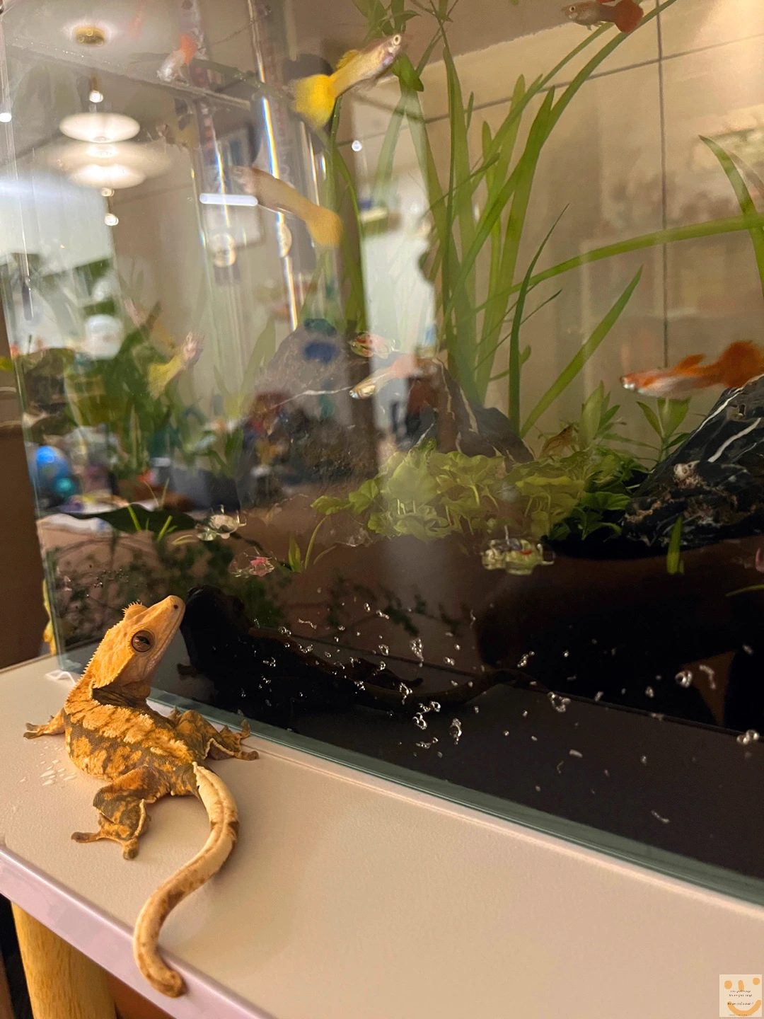 마뱀이를 수조 앞에 데려가 구피 물고기 보여주기