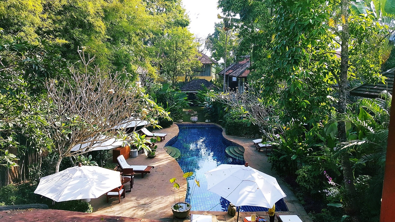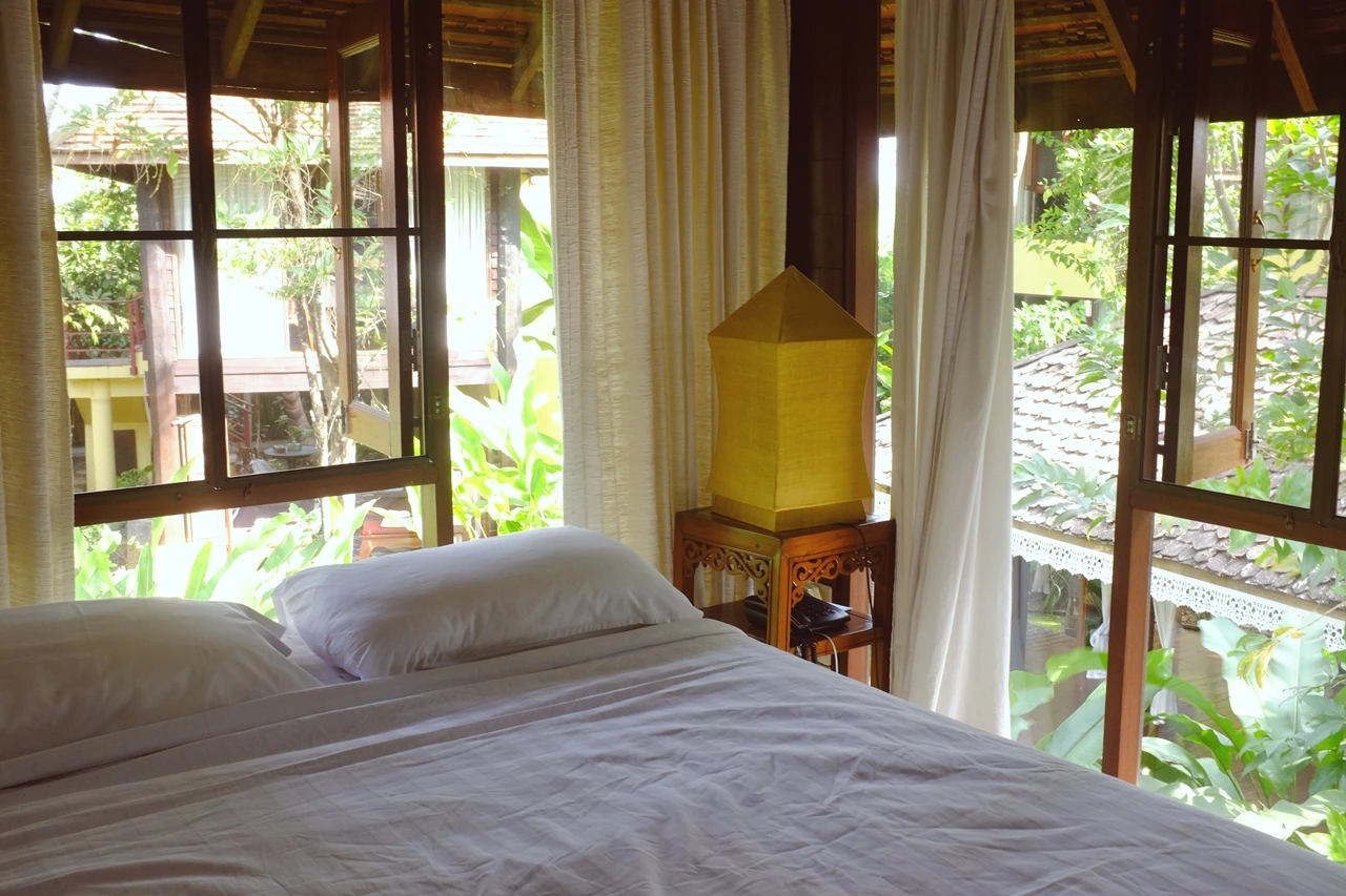 중심가에서 멀리 떨어져 있지만 바로 그 덕에 고요하게 머물 수 있는 곳이라더니, 과연 택시는 한참을 달렸다. 그리고 리조트는 정말로 고요하고 평화로웠다. 샤워가 간절했는데, 짱 친절한 직원들이 아침 8시 댓바람부터 체크인을 허락해준 덕에 긴긴 하루를 차지할 수 있었다. 울창한 나무 사이사이 2층으로 이루어진 방갈로가 독채 형식으로 있는 구조였다. 아래층은 낮잠을 자거나 쉴 수 있는 마루 공간이고, 2층이 숙소였다. 전통적인 태국 스타일로 지어진 숙소 내부는 사방으로 창문이 나 있어서 솔솔 들어오는 바람소리가 말할 수 없이 좋았다. 하루 종일 침대에 누워 바람 소리를 들어도 좋을 것 같았다.