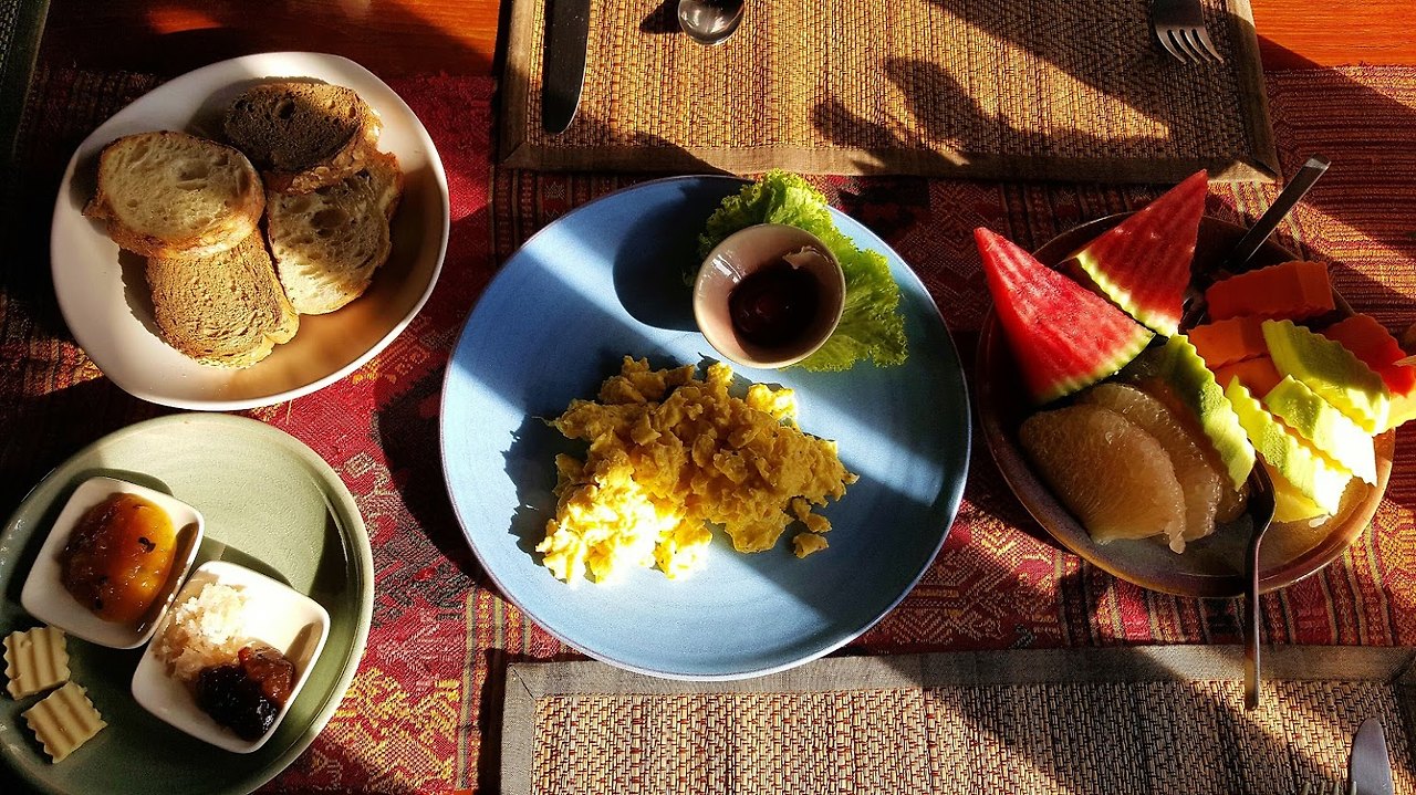 그 마지막 의식을 치르기 위해 리조트 안의 레스토랑으로 향했다. 탱글탱글 신선한 열대과일과, 닭고기와 갖은 야채가 듬뿍 들어간 쌀죽, 빵과 수제 잼도 종류별로 가지가지. 볕이 좋은 창가 자리에서 풍성한 아침 식사를 즐겼다. 그리고 달걀 요리는 따로 주문할 수 있어서, 스크램블드 에그를 주문했다.