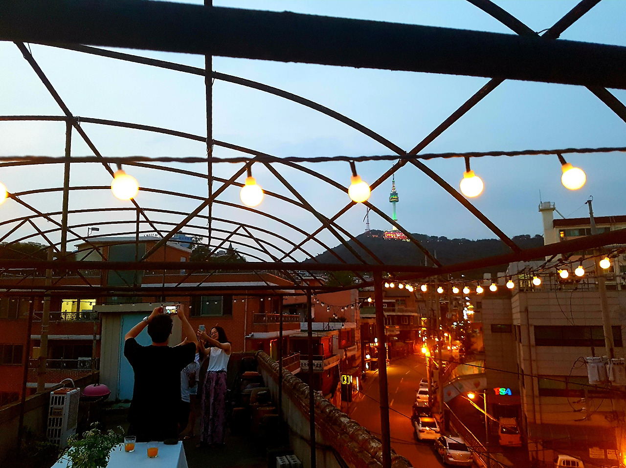 아, 스터디를한 파티룸 Mave에 대해 궁금해 할 사람이 있을지도 몰라 스터디 후에 이어진 막간의 루프탑 타임 내용도덧붙인다. 나갈 시간이 임박해버려서 길게 즐기지 못해 아쉬웠지만, 경사로를따라 이어지는 해방촌 골목에 내리는 저녁 어스름과 조명이 들어온 남산타워의 모습, 옥상에 밝혀진 전구불빛이 여름날 저녁을 더욱 운치 있게 만들어줬다.