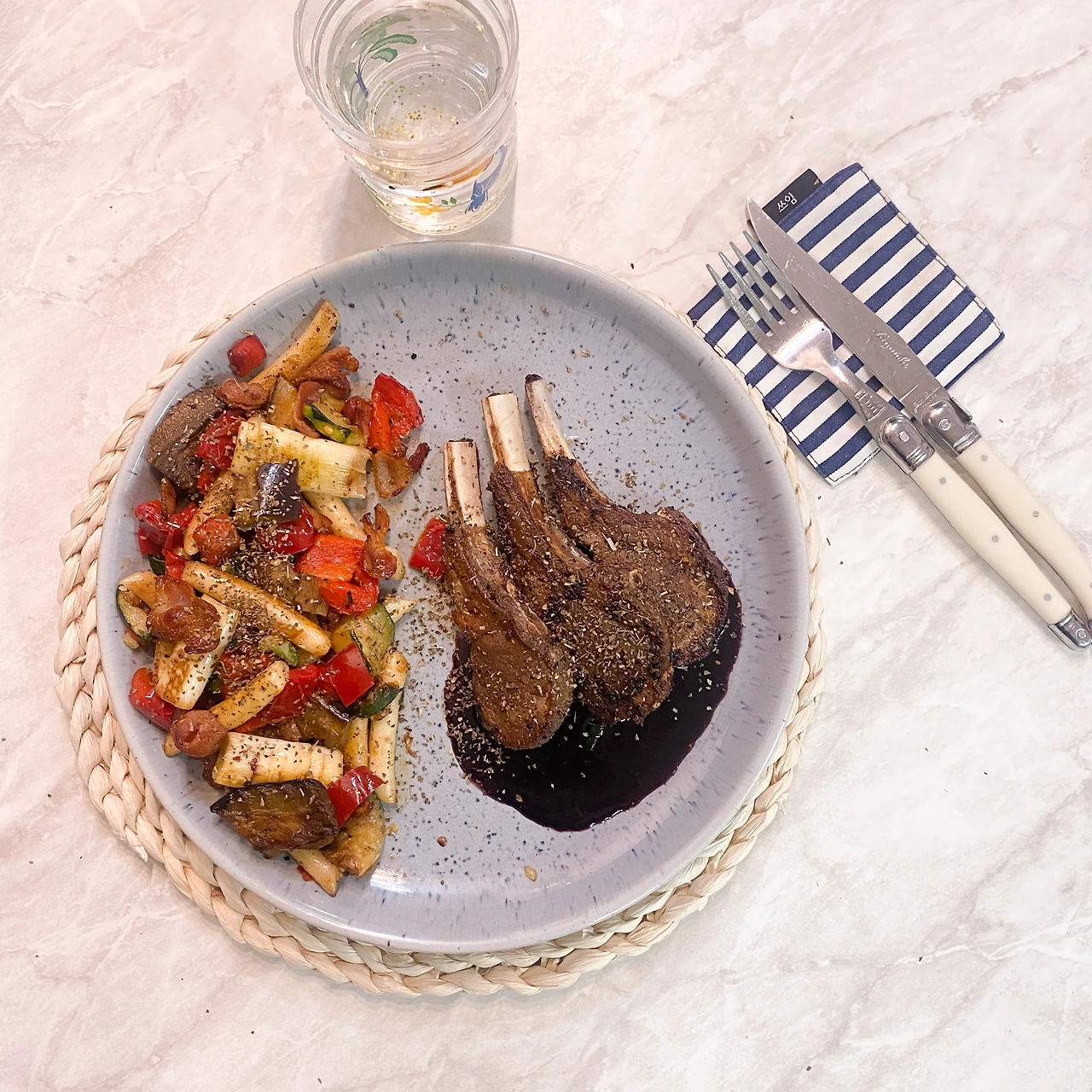 * 소금 때문에 삼투압 현상이 발생하여 수분이 발생하기 때문에 랩핑없이 냉장고에 넣어서 수분을 충분히 날려준다.(샐러드 야채도 같은 원리로 씻은 후 냉장고에서 수분을 날리면 식감이 바삭하다) 양고기는 한 쪽당 두께가 뻔하기 때문에 최대한 수분을 날려 단시간에 겉바속촉으로 만드는 게 포인트!