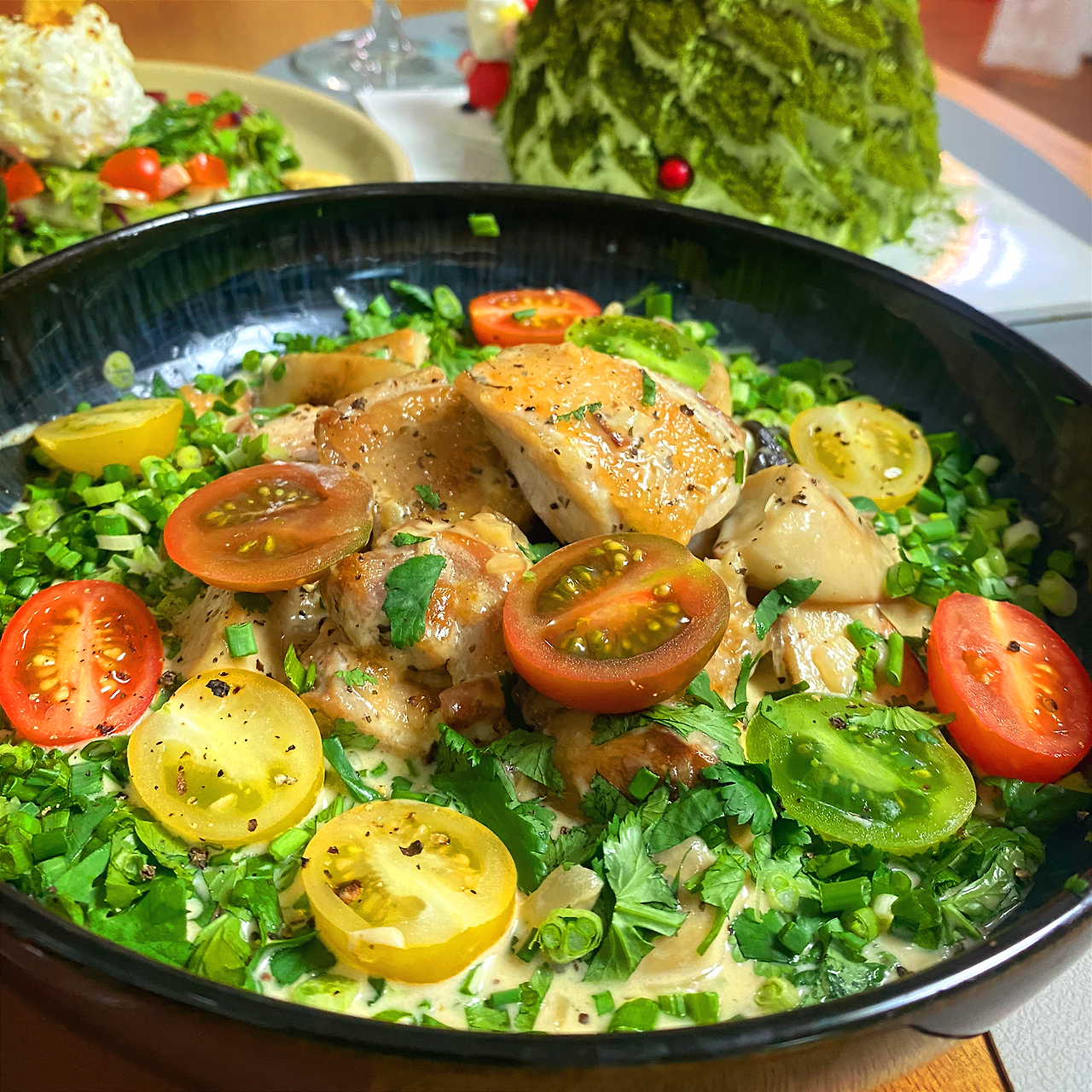 4. 생크림 소스를 부어주고 빼놓은 닭다리살을 반대로 살 부분이 소스에 잠기게 넣고 같이 조려 준다. 자작하게 할지 바짝 조려서 수분이 없이 할지는 선택 사항이니 취향 것.