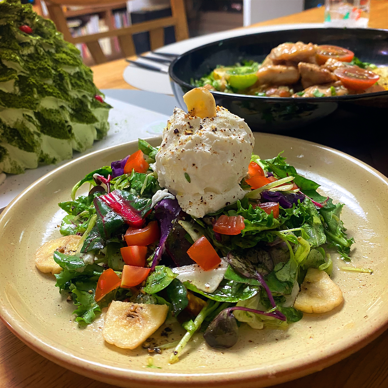 올 크리스마스 메뉴는 리코타 치즈 샐러드와 볼로네제 링귀니 파스타, 치킨 크림스튜를 준비했다. 유튜브 음악채널로 캐럴도 틀어두고 케이크에 초도 불고 맛있게 먹었다.