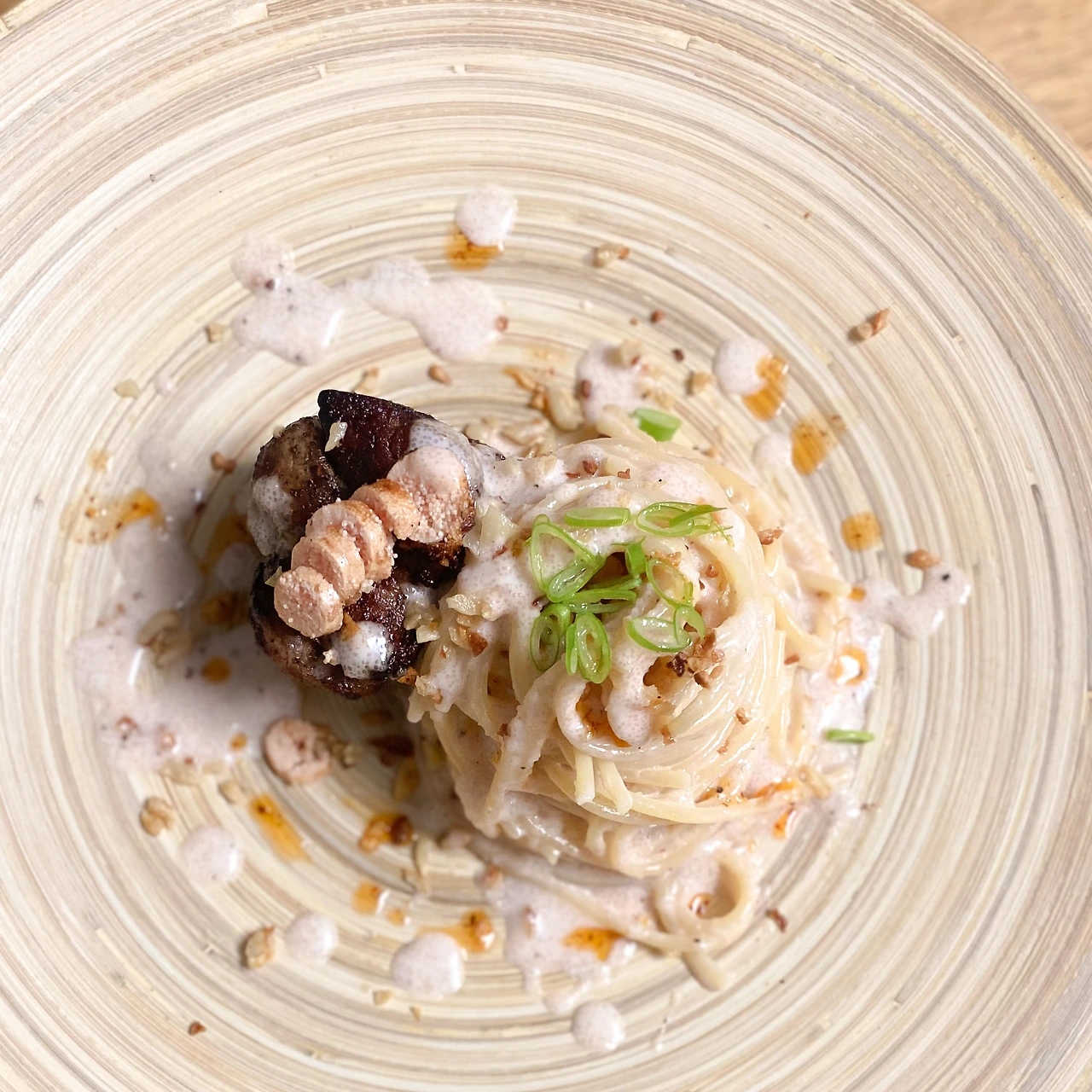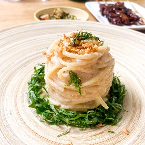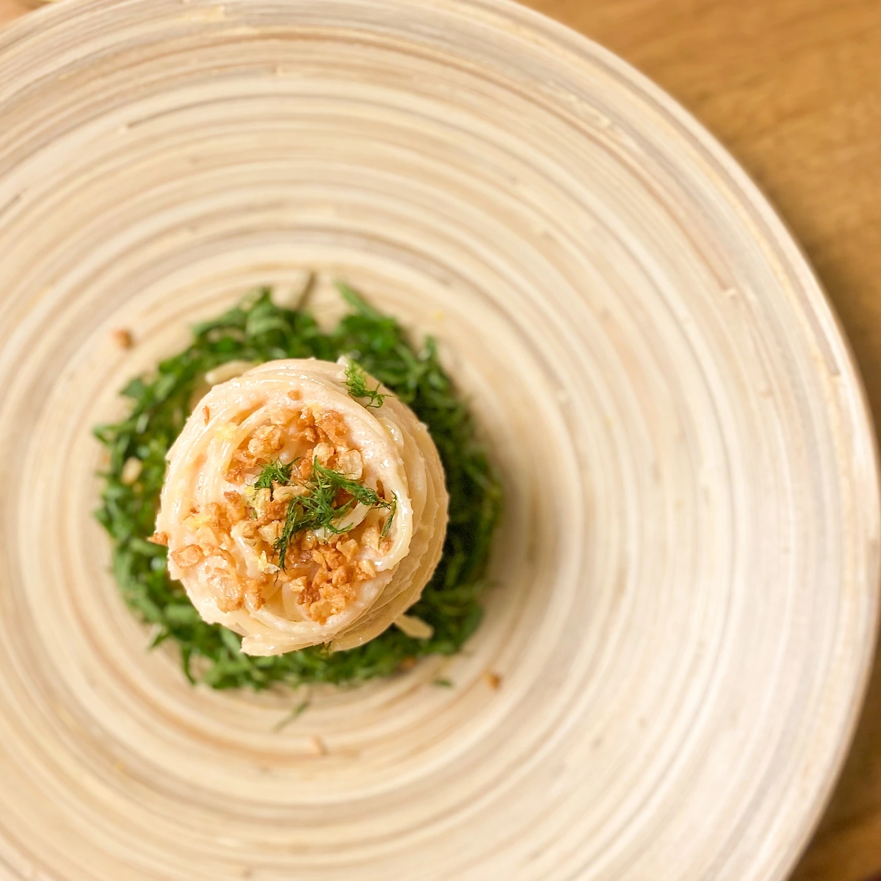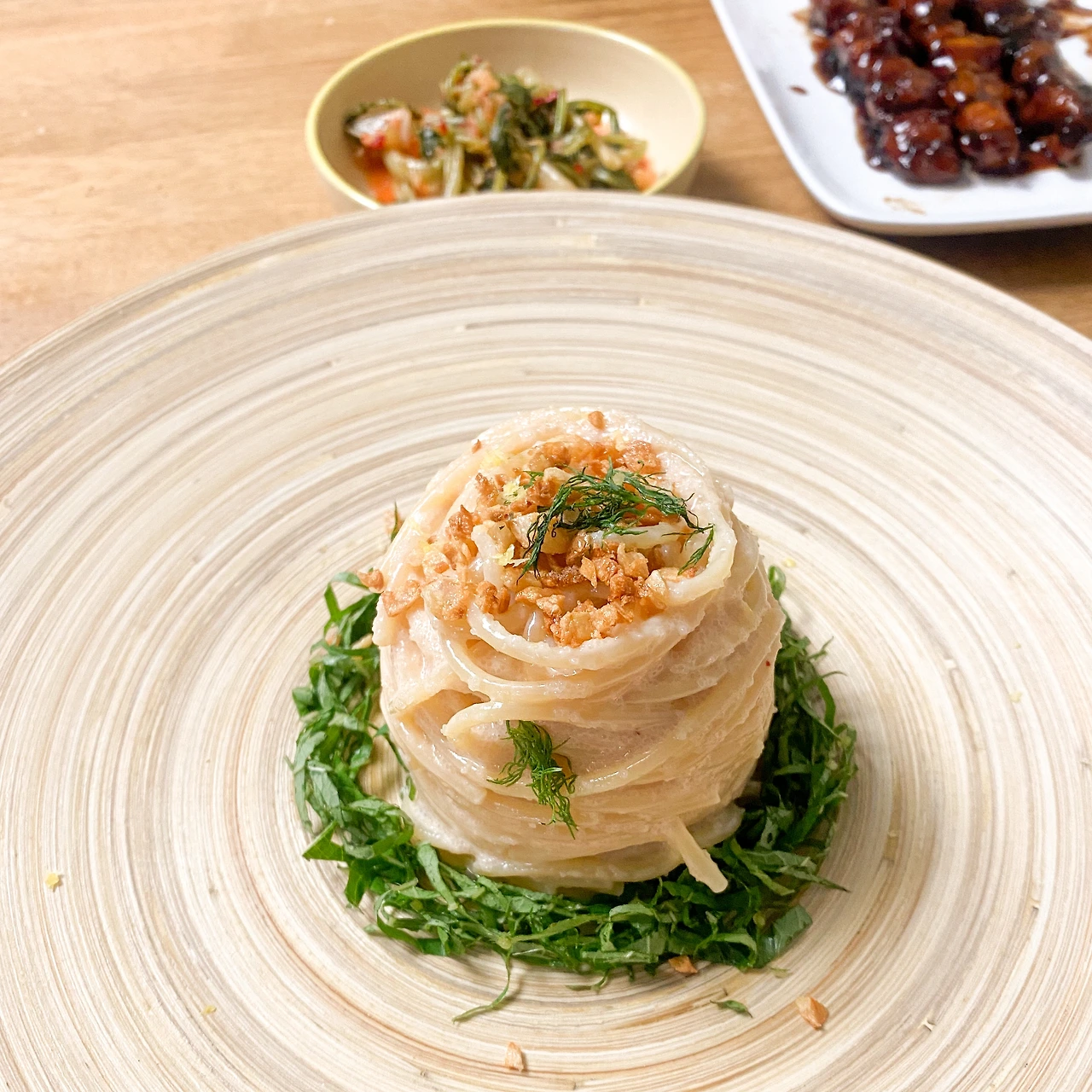 6. 팬 안에서 가열하는 명란 파스타 레시피에 비해서 고소함이 떨어지기 때문에 마늘 칩을 뿌려서 맛과 식감을 보완해준다.