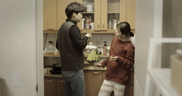 이번에는 삼척에 있는 수현의 부모 집으로 가보자. 수현의 어머니 맞은편에 무릎 꿇고 앉은 지영이 전을 부치고 있다. 수현과 다르게 지영은 초반부터 예비 며느리로서의 자리 하나를 차지하지만 그 자리는 그녀가 끊임없이 노동함으로써 지켜진다. 전을 부치고 국을 퍼담고 잔을 채우는 등의 역할을 다하는 대가로 그녀는 프레임 밖으로 밀려나지 않는다는 보상을 받을 수 있다.