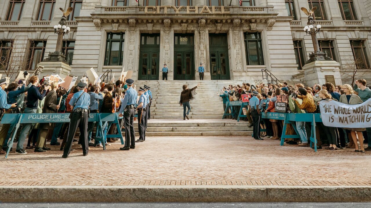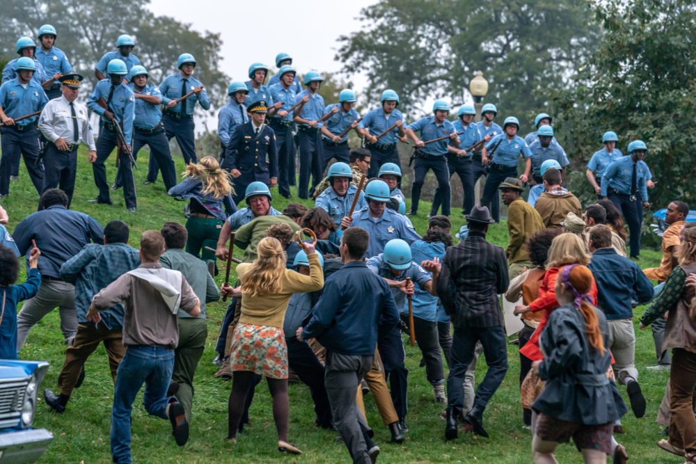 시위대가 경찰과 주 방위대 연합과 무력 충돌하는 낮과 밤의 두 야외 신은 자신에겐 액션 신과 다름없었다는 소킨의 소회가 수긍이 갈 만큼 규모가 느껴진다. 그는 작정하고 힘을 준 그림을 초장에 다 보여주는 하수가 아니다. 두 야외 신은 재판이 진행되는 동안 과거 시위를 불러들이는 서사 구조에 따라 각각 중반과 후반에 등장하여 영화의 열기를 달구는 불쏘시개 역할을 한다.