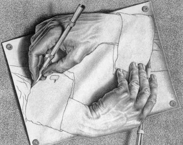 예전에 제가 프로필로 자주 사용했던 사진 중에 네덜란드 출신의 아티스트 MC. 에셔란 분이 있습니다. 그의 작품을 보면 이런 역설을 주제로 한 작품들이 많죠. 아마 한 번쯤은 다들 보셨을 텐데요, 그중 대표적인 작품이 손을 그리는 손입니다.