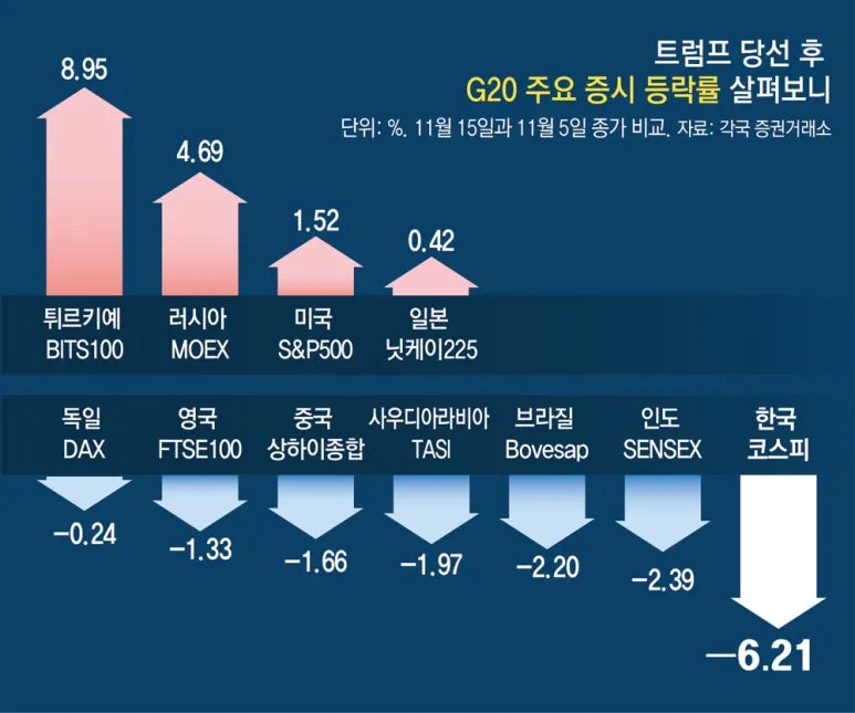 앞으로 국내 경제는 최근 미 대선 결과 트럼프 재집권이 확정되면서 미국 우선주의, 보호주의 무역으로 수출 주도 경제에 타격이 우려된다. 대표적 경제 선행지수인 주가지수 코스피는 이미 G20 수익률 중 최악을 기록했다.