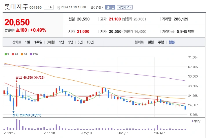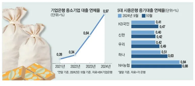 기업은행에 따르면 2024년 중소기업 연체율 또한 1%에 육박하고 있다. 기업 도산으로 더욱 많은 실업자(혹은 그냥 쉬었음)가 양산될 것이 우려된다. 이는 중소기업뿐만이 아니다. 현재 고환율(원화 약세, 달러 강세)로 인한 내수 침체, 출산율 감소로 인한 수요 감소로 대표적인 유통 대기업마저 흔들리고 있다. 롯데그룹 위기설로 최근 롯데지주는 52주 신저점을 기록하기도 했다.
