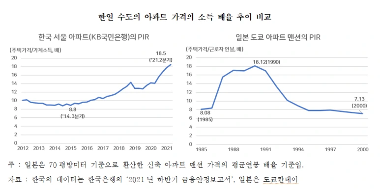 2021년 국가미래연구원(ifs) 조사에 따르면 우리나라의 PIR은 KB국민은행의 서울지역 아파트 가격을 기준으로 보면 2014년 3분기의 8.8배에서 2021년 2분기에는 18.5배로 급상승했다. 이는 일본이 경험했던 부동산 버블의 절정기인 1990년과 비슷한 수준이다. 도쿄지역의 맨션아파트의 PIR(도쿄칸테이-일본 최대급의 부동산 데이터 기업-기준)이 1985년의 8.08배에서 급상승해 1990년에는 18.12배를 기록한 바 있다. 도쿄지역의 장기평균 PIR은 8배 정도로 평가되기 때문에 1987~1993년 동안은 평균선에서 이탈했던 버블이 존재했던 것으로 볼 수 있다.