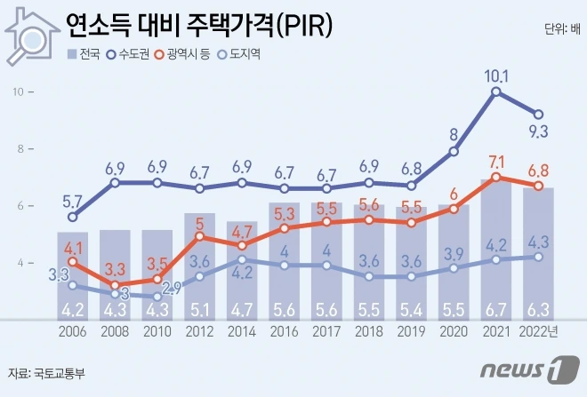 먼저 국토교통부 자료는 연 단위로 나온다. 최근 자료가 2022년인데 수도권 기준 PIR은 9.3으로 상당히 안정적으로 보인다. 2022년은 기준금리 인상으로 부동산 거품이 막 걷히기 시작하던 때이다.