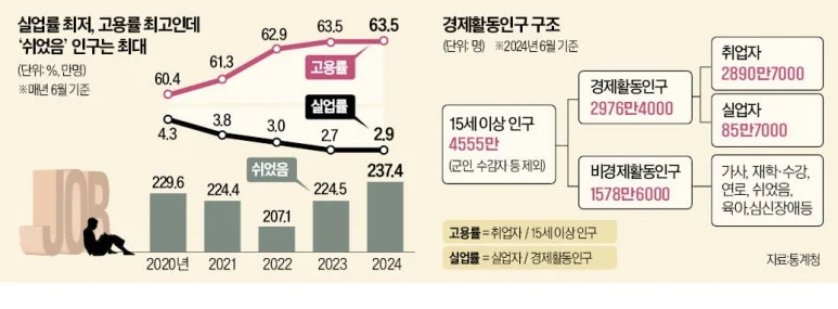 통계청에 따르면 실업률은 2.9%로 예상보다 낮은 것처럼 보인다. 그러나 구직활동 단념을 의미하는 쉬었음 인구는 증가하여 2024년 역대 최대 237만 명을 기록하고 있다. 실질적 실업률이 증가하고 있는 것이다.