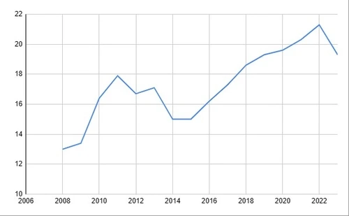 반면 연합인포맥스에서 2023년 PIR 조사대상을 서울 신축 아파트(1~5년)로 자체 조사한 적이 있다. 대상 기간은 2006년부터 2023. 10월까지이다. PIR은 2022년 21.3을 최고점으로 상승한 후 23. 10월 19.3으로 소폭 조정되었다. 똘똘한 한 채, 얼죽신(얼어 죽어도 신축) 열풍의 결과이다.