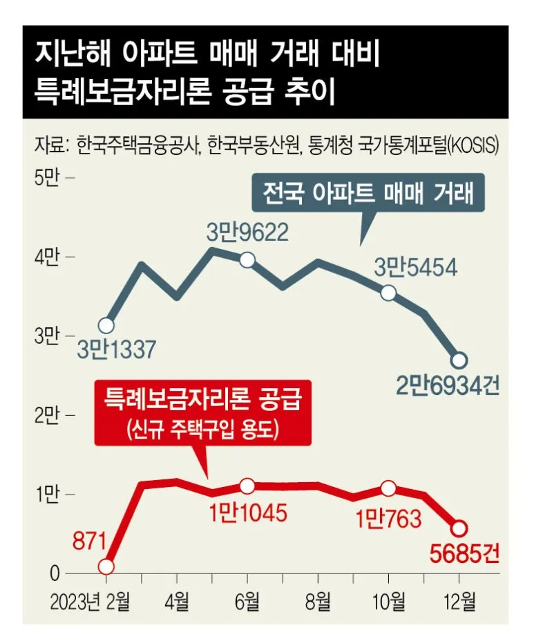 한국주택금융공사에 따르면 특례보금자리론 가운데 2023년에만 10만2671건(25조8126억)이 신규 주택구매 용도로 공급된 것으로 나타났다. 이는 지난해 우리나라 전체 아파트 매매 건수인 41만1812호(한국부동산원 부동산통계정보 기준)의 4분의 1에 이르는 규모다. 지난해 서울 전체 매매 규모(3만6439호)의 거의 3배, 경기도 전체 매매 규모(10만4350호)에 버금가는 수준이다. 아파트 매매 시장에서 가격을 크게 좌우할만한 거래량이다.