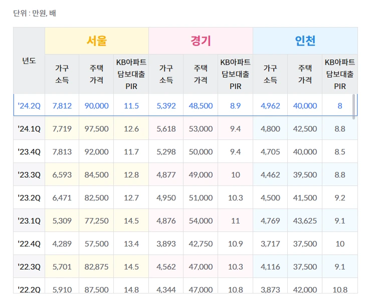 KB부동산은 분기별로 PIR 자료가 나온다. 서울 기준 2022년 2분기 14.8을 정점을 찍고 24년 2분기 11.5까지 내려왔다. 같은 기간 경기도는 10.8에서 8.9로, 인천은 10.8에서 8로 PIR이 하락했다.