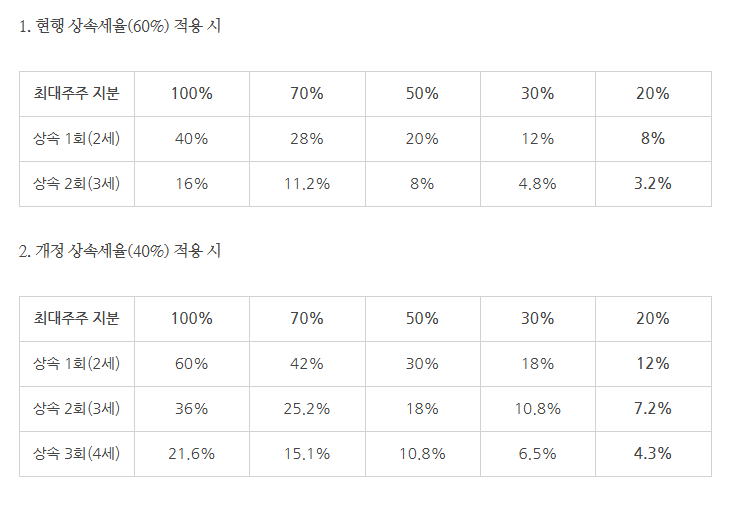 비상장 대기업으로 특수관계인이 100%인 기업은 국내에 사실상 존재하지 않는다. 그럼에도 불구하고 대조를 위해 같이 시뮬레이션 했다. 기업 지분, 경영 환경 등 다른 조건이 동일하다고 가정했을 때 100% 지분을 가지고 있더라도 가족이 경영승계를 통해 60% 상속세를 납부하고 나면 3대째 지분은 16%로 평균 최대주주 지분율(30~40%)를 감안하면 최대주주 지위를 잃게 된다.