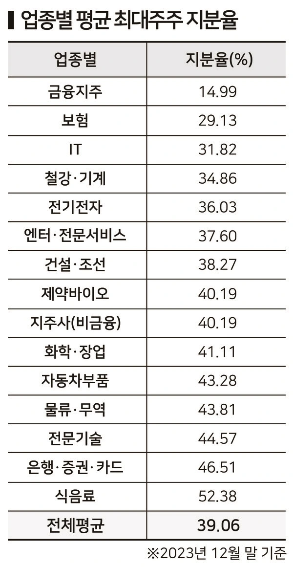 우리나라 국내 시총 250대 기업의 최대주주 지분율을 분석한 자료에 따르면 평균 30% 수준이다.