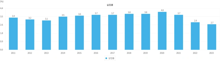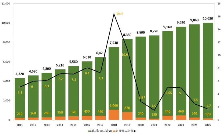 먼저 최저임금 인상률을 살펴보겠다. 문재인 정권 출범 후 2018년 16.4%, 2019년 10.9% 급격한 인상이 인상적이다. 이후 코로나19 사태에 따른 경기 침체로 최저임금 인상률은 정상화되었지만 이미 최저임금은 1만 원대에 진입하였다.