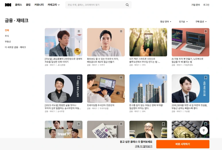 그렇다면 성인들의 투자 시장은 어떤가? 국내 대표적인 온라인 강의 사이트인 <클래스101>에도 꽤나 많은 유료 투자 강의가 있다.