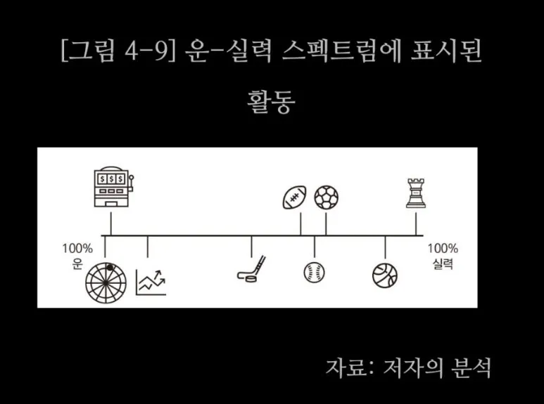 그리고 가장 잊지 말아야 하는 점은 이것이다. 주식시장은 운-실력 스펙트럼에서 운에 매우 가깝다. <마이클 모부신 운과 실력의 성공 방정식>에 따르면 주식 투자는 약 90%가 운이라고 한다. 반면 체스와 같은 경기는 실력이 거의 100%를 차지한다. 사실 워런 버핏도 미장이 아니라 국장이었으면 물로켓이었을 확률이 매우 높다. 미국 시장은 장기적으로 우상향이었기 때문이다.