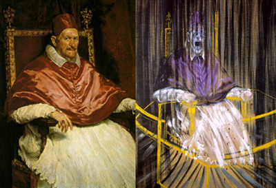 좌) 디에고 벨라스케스, 교황 인노켄티우스 10세. 우) 프란시스 베이컨, 벨라스케스의 교황 인노켄티우스 10세를 본뜬 습작