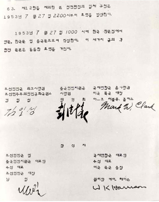 그 지독한 피와 땀, 눈물의 대가로 아래와 같은 유엔군과 조선인민군(북한), 중국 인민지원군 간 정전협정문이 작성되었다. 그리고 종전은 여전히 이루어지지 않고, 전쟁의 불씨는 여전하다. 언제라도 위기 상황이 벌어진다면 다시 한번 각국의 엘리트들은 전쟁과 관련된 문서 작성에 동원될 것이다. 새로운 인류인 소셜 미디어 세대는 전쟁을 글로 보는 것이 아니라 이미지와 영상으로 접한다. 하지만 비극은 직접 겪어보기 전까지 그것은 한갓 유흥거리에 지나지 않을 것이다. 타인의 고통을 느낄 수 있는 엘리트가 많아야 전쟁의 위험성은 줄어들고, 문서의 행간에 인간적인 고뇌가 느껴지지 않을까?