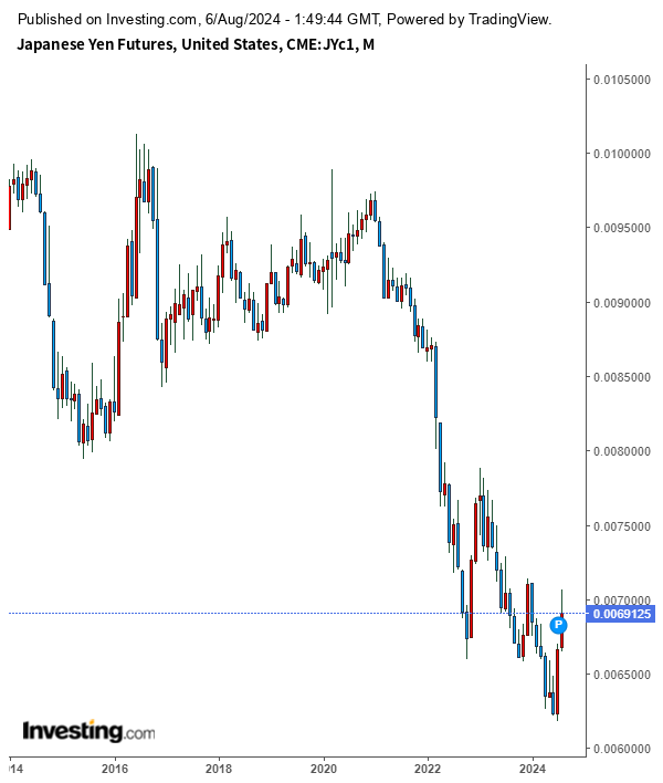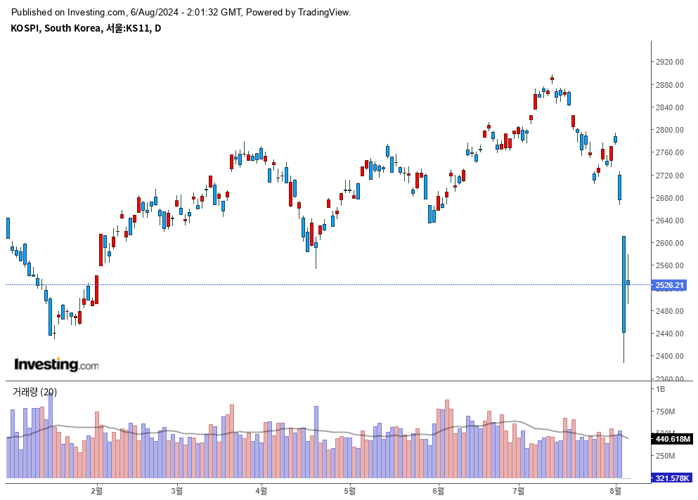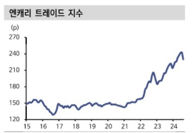 전 세계 엔 캐리 자금 규모는 20조 달러(약 2경 7420조 원)로 추산되며, 국내 상장주식에 투자한 일본계 자금은 16조 2천억 원가량이다. (중략) 과거 엔 캐리 자금 청산 때마다 코스피 낙폭은 매우 컸다. 모두 다섯 차례인데, 당시 코스피의 고점 대비 낙폭은 1차(1998년) 때 38.9% 하락한 것을 비롯해, 2차(2002년) 15.9%, 3차(2008년) 56.7%, 4차(2015~2016년) 10.9%, 5차(2020년) 35.7% 등이었다. 엔 캐리 자금 청산 기간 중 국내 주식 매도 주체에서 외국인이 차지하는 비중은 적게는 65.4%(2차)에서 많게는 94.7%(4차)에 달했다. 엔 캐리에 나섰던 외국인 이탈이 하락장을 주도했다는 얘기다. -엔 캐리 공포가 증시에 미칠 영향 살펴보니…"2000년대보단 제한적" 이유는, (2024.8.4, 연합인포맥스)