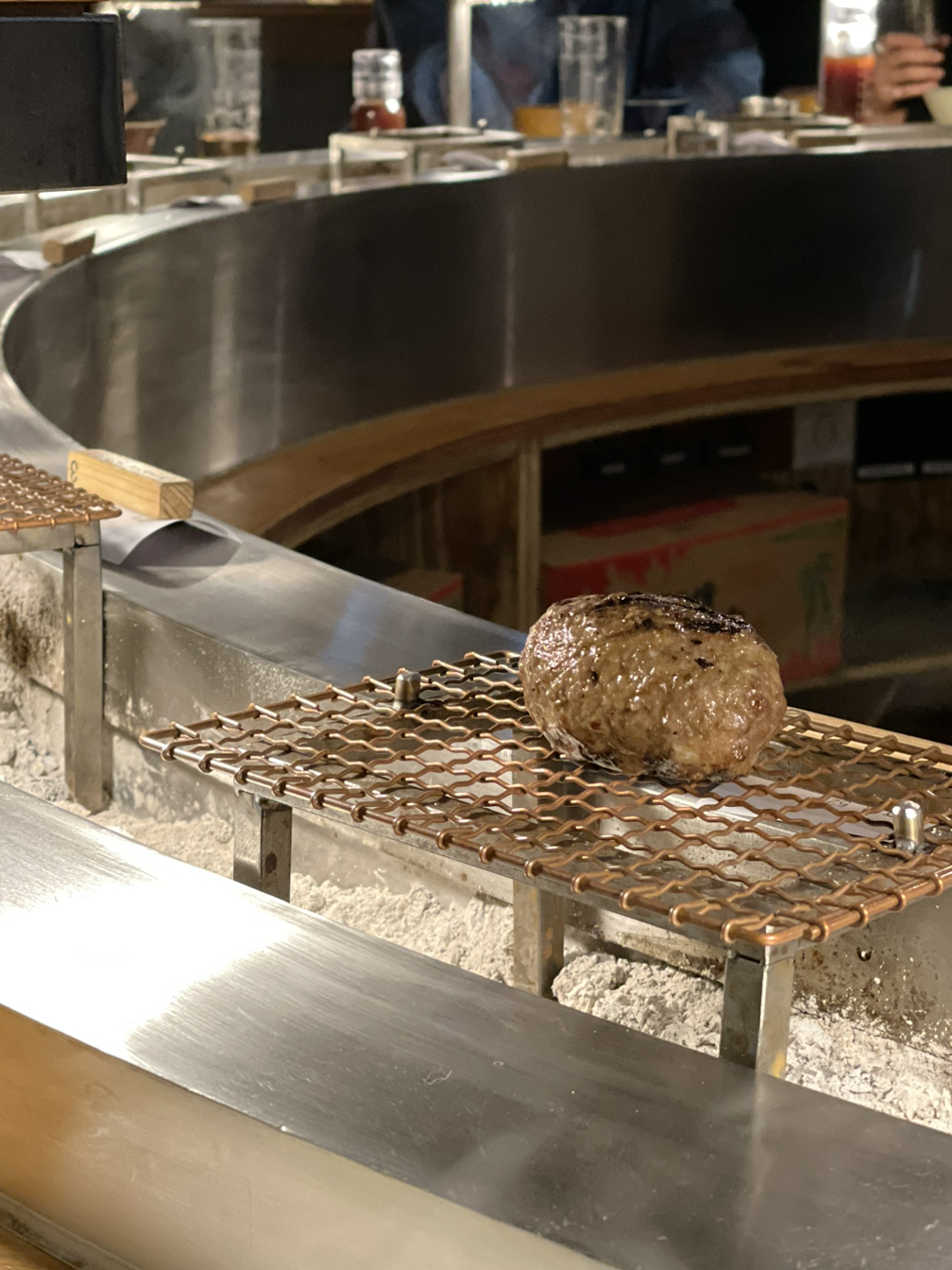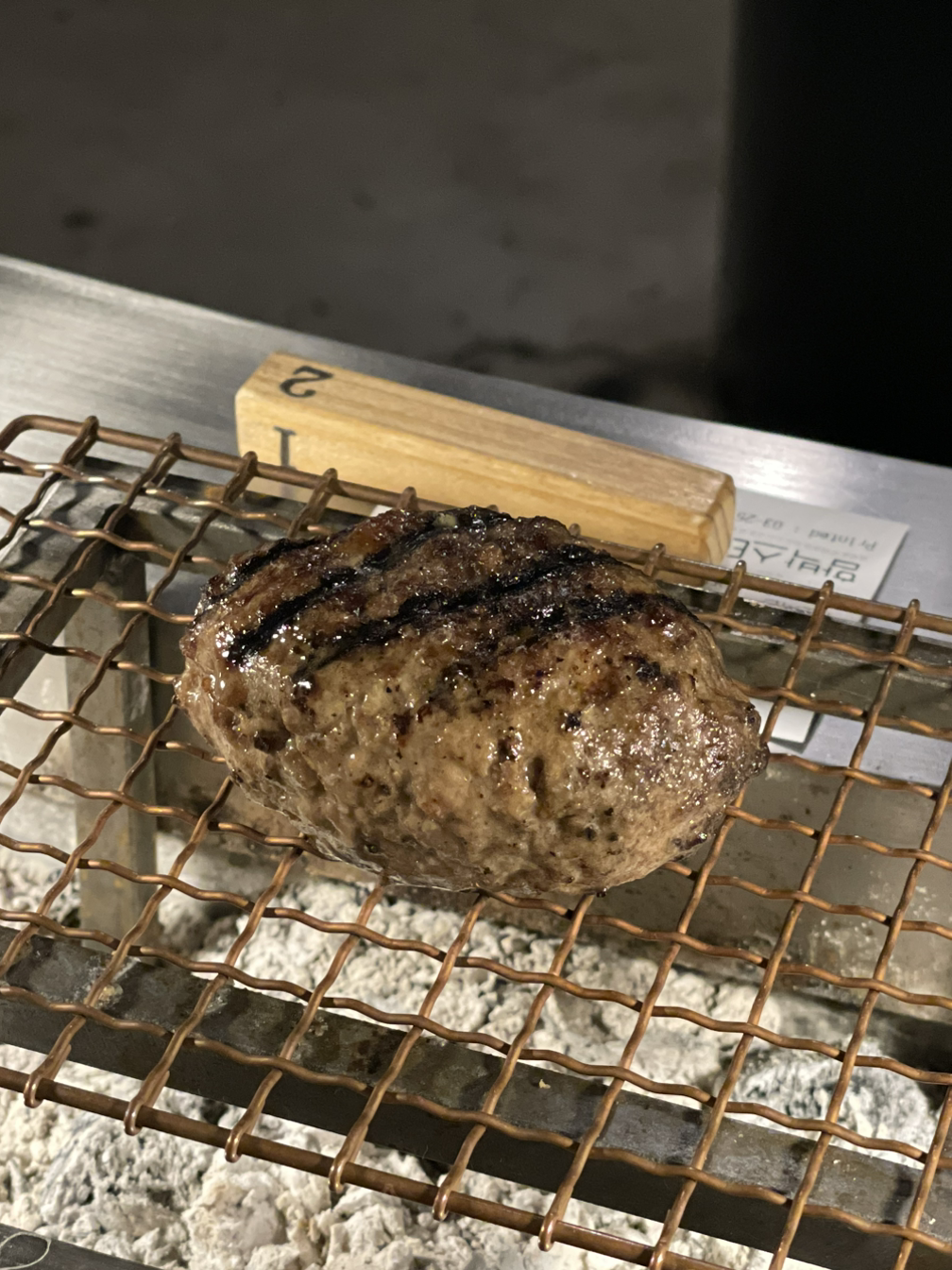 숯불에 구워지면 개인 그릴에 직원분이 함박 스테이크를 옮겨주신다.