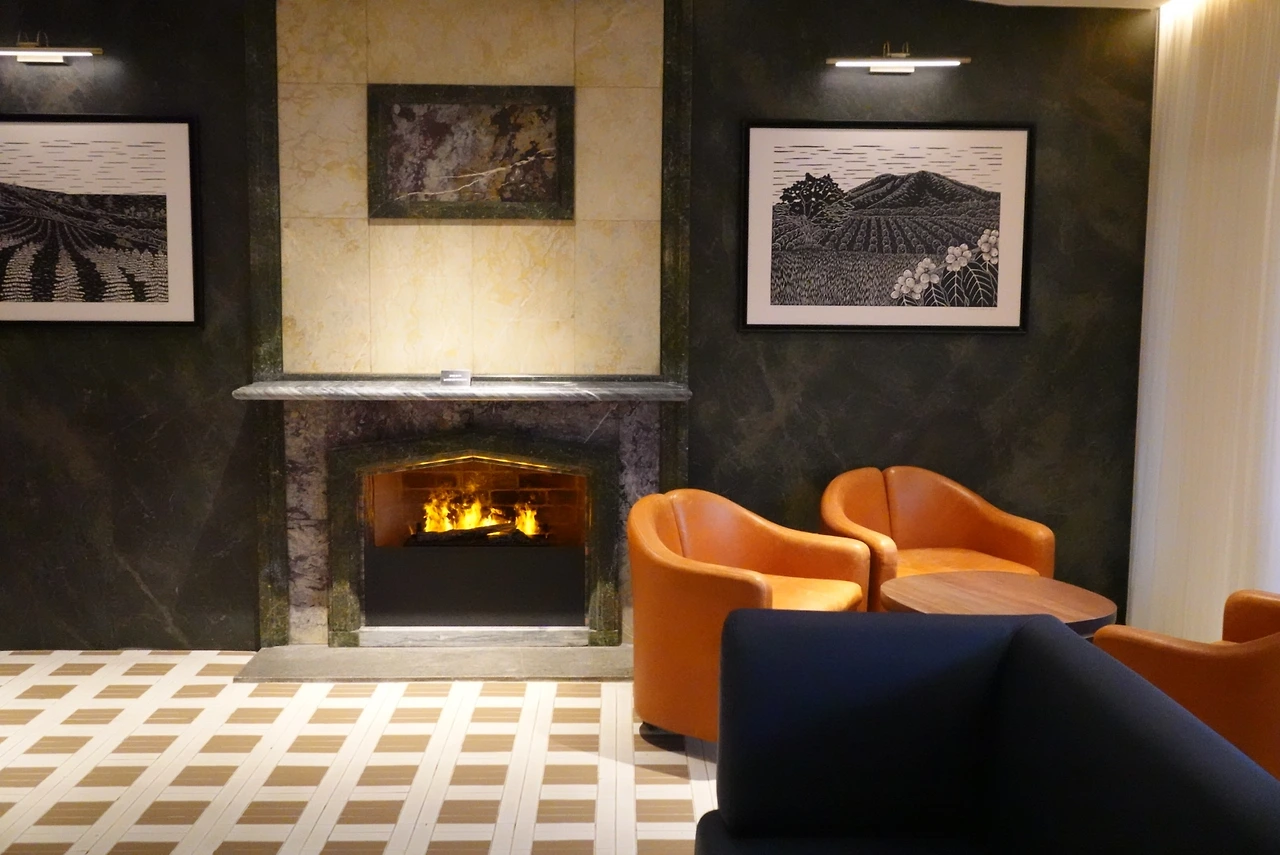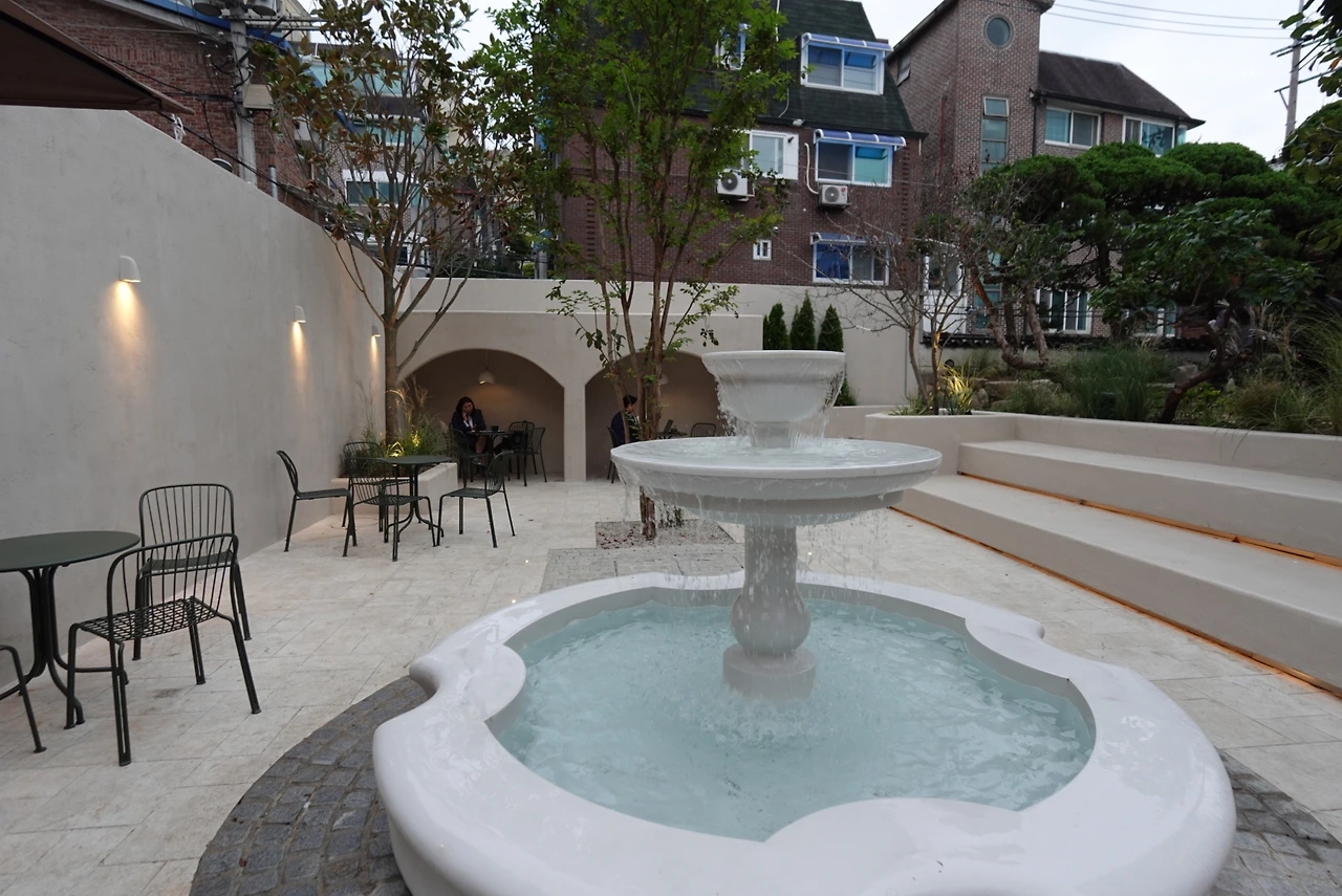 이곳의 가장 큰 매력 중 하나는 외부에 있는데 저택의 마당과 분수대가 곁들여진 공간에서 커피를 즐길 수 있다는 점이다,