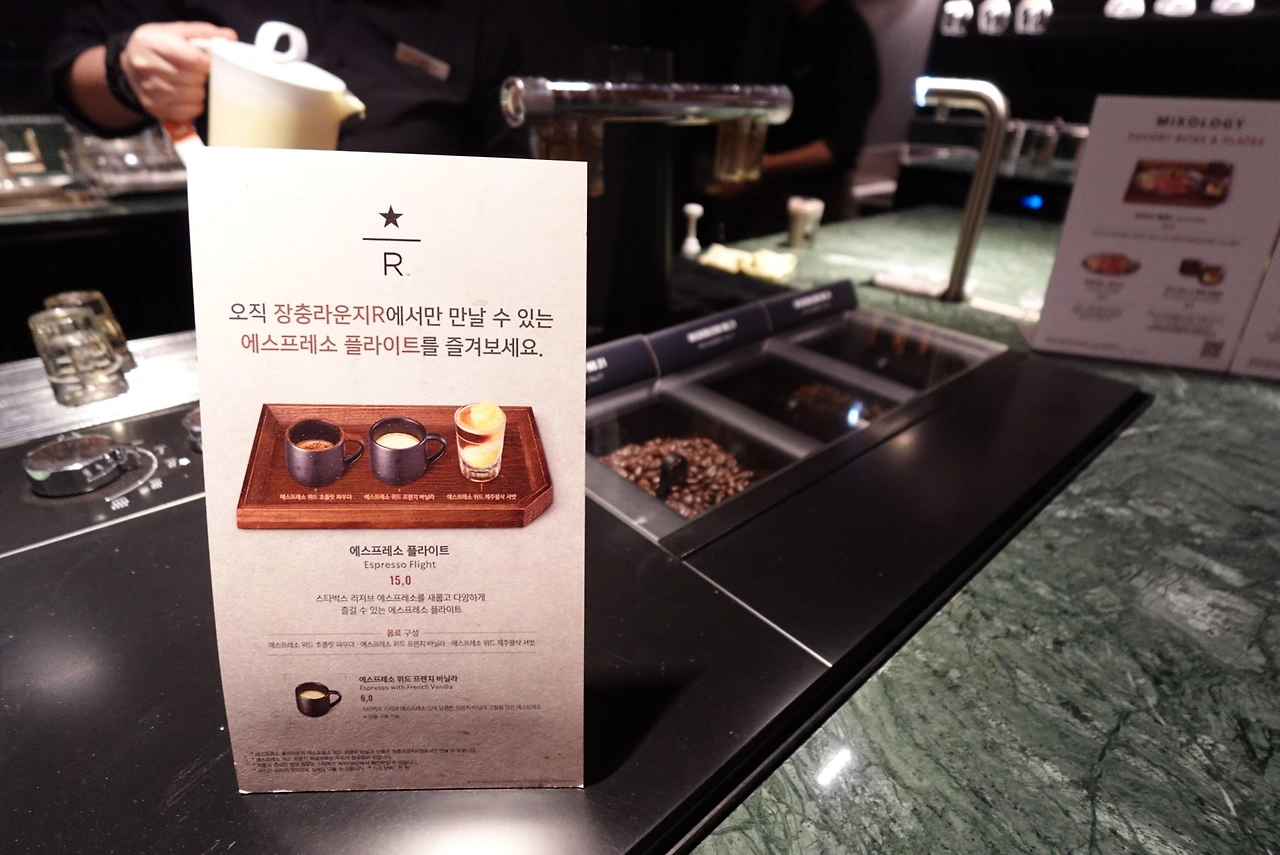 1층으로 올라가면 메뉴를 주문받는 카운터가 있는데 기본적인 스타벅스 리저브 메뉴를 비롯하여 장충라운지R점에서만 만날 수 있는 메뉴들이 있다.