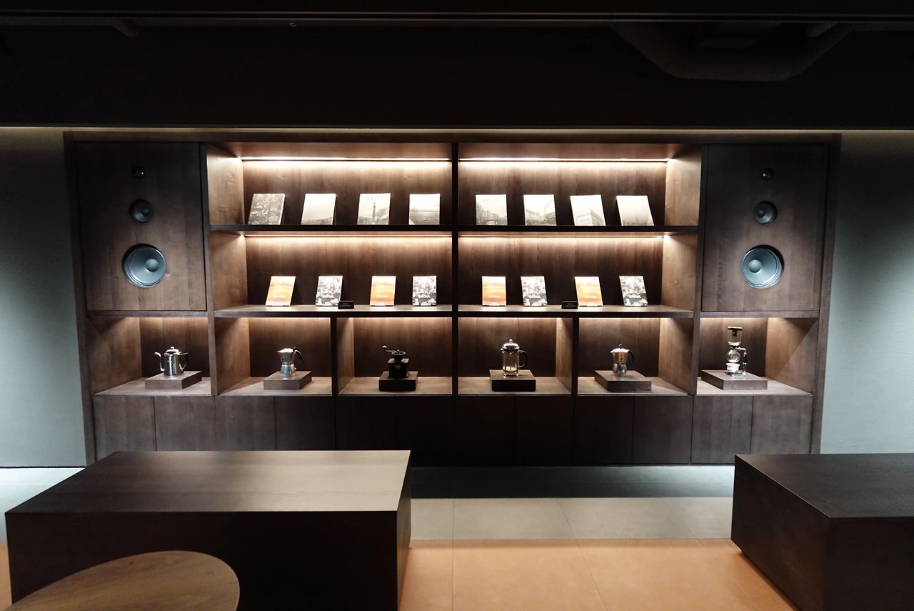 음향 장비를 비롯하여 모카포트, 사이폰 등 커피를 다양하게 추출하는 데 도움을 주는 장비들이 나열되어 있다. (스타벅스에서 모카포트나 사이폰을 쓰나..?)
