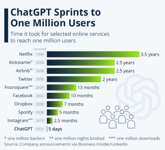 5일, chatGPT가 100만 명의 사용자를 얻기까지 걸린 시간으로 이처럼 빠르게 퍼진 서비스는 처음이었어요. 마치 진짜 사람이랑 대화하는 것처럼 느껴지는 생생함은 알파고 이후 사람들이 기다려 왔던 바로 그 서비스였던 거죠. 순식간에 입소문을 타고 퍼진 chatGPT는 어느새 세상의 일부로 자리 잡게 되었네요.
