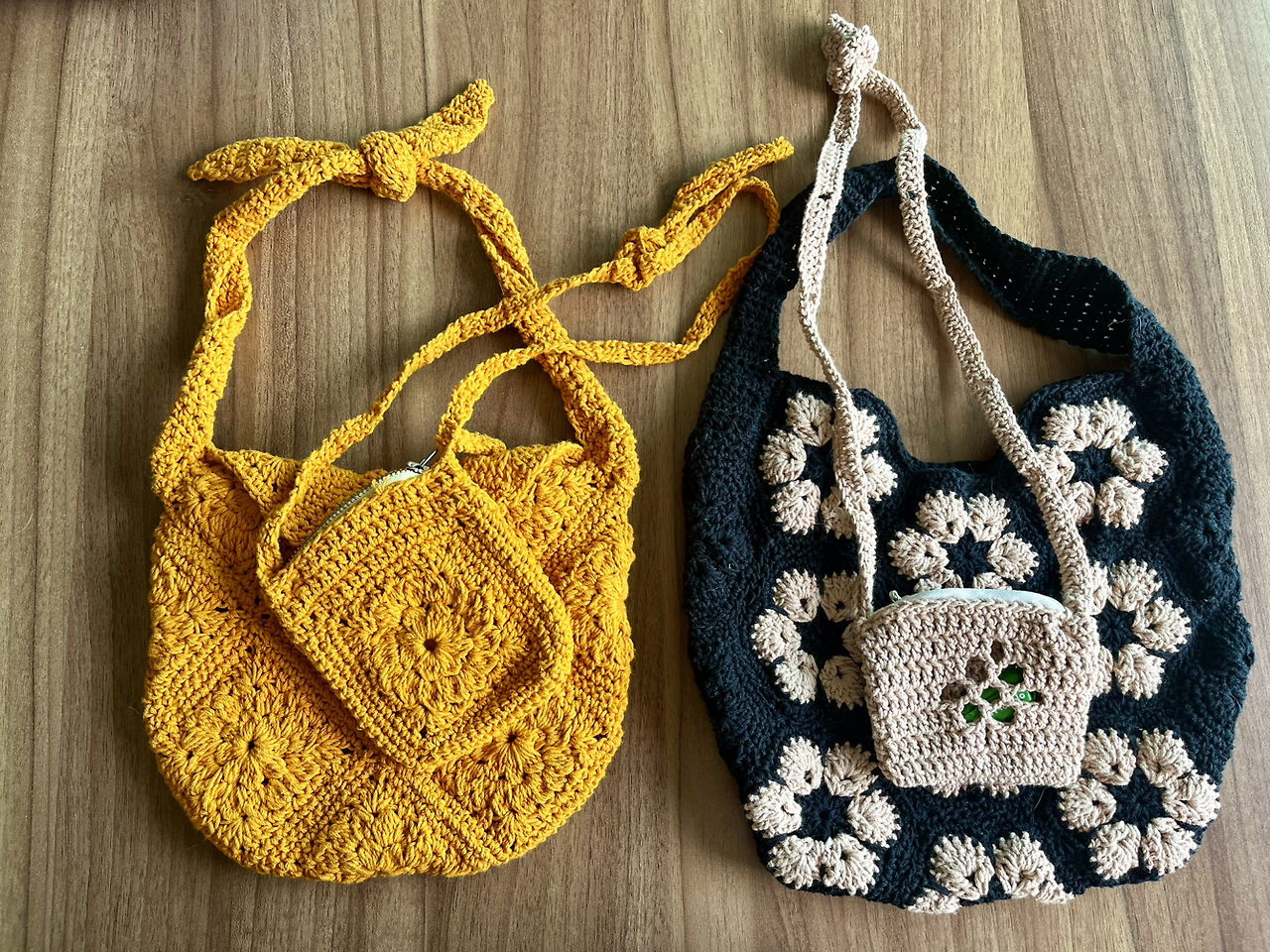 남편에겐 미안하지만, 어쩌다보니 뚱이와 엄마만 갖고 다니는 커플 아이템도 하나 생겼다. 바로 손뜨개 가방이다. 나의 취미 중 하나가 코바늘 뜨개질이다. 잘 뜨지는 못하지만 나는 뜨개질을 하며 손끝에만 집중하는 시간을 참 좋아한다. 출산 이후에는 한참을 손에서 놓았던 일인데, 뚱이가 자라고 밤에 여유가 생기면서 다시 시작했다.