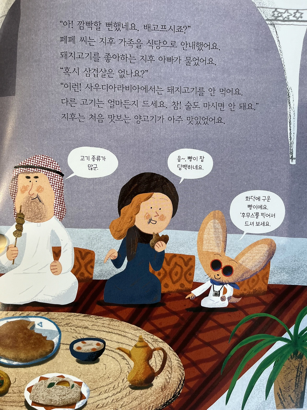 나는 한참을 웃었다. 그리고 이 말을 얼른 전해주고 싶어서 그날 남편이 퇴근하기를 얼마나 애타게 기다렸는지 모른다. 여섯 살 뚱이가 파악한 아빠의 취향은 삼겹살, 소주, 매운 음식, 아이스 아메리카노다. 뚱이에게 돼지고기도 못 먹고 술도 살 수 없는 나라는 아빠가 갈 수 없는 나라나 마찬가지다. 그리고 그 나라는 사우디아라비아였다.